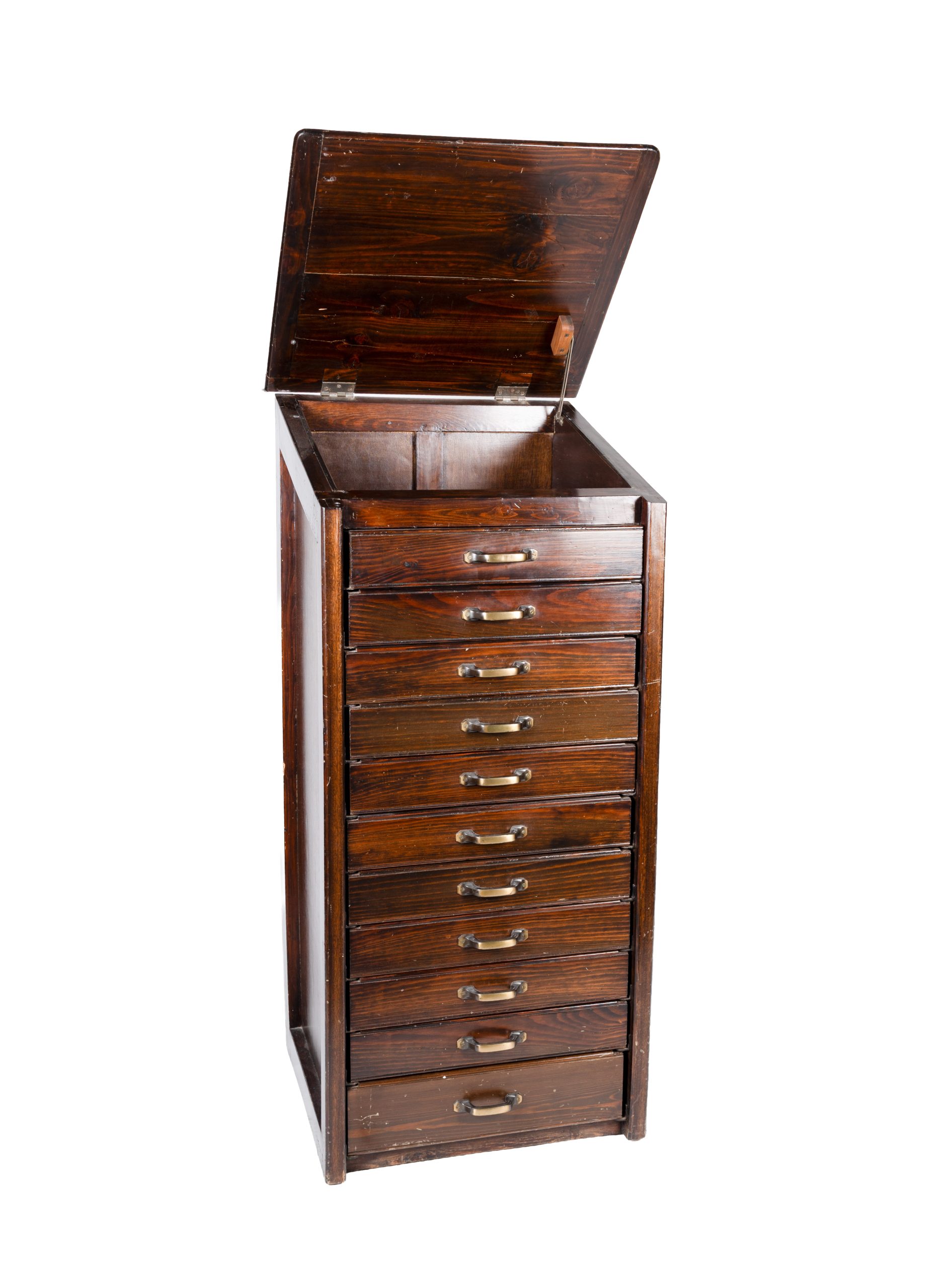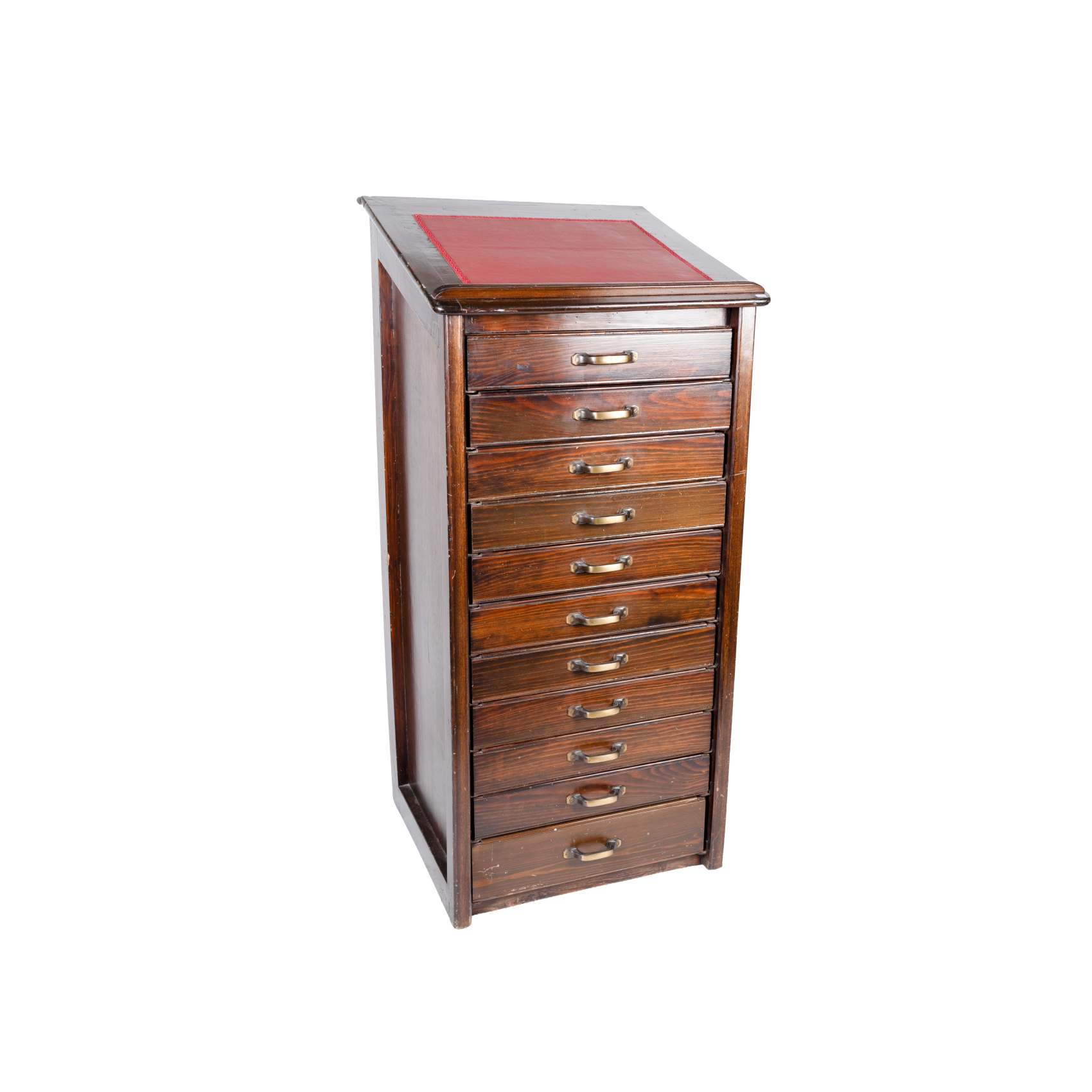 Mueble archivador en madera de pino con sobre superior tapizado en cuero rojo, s.XX. Frente con once cajones y tiradres en metal.