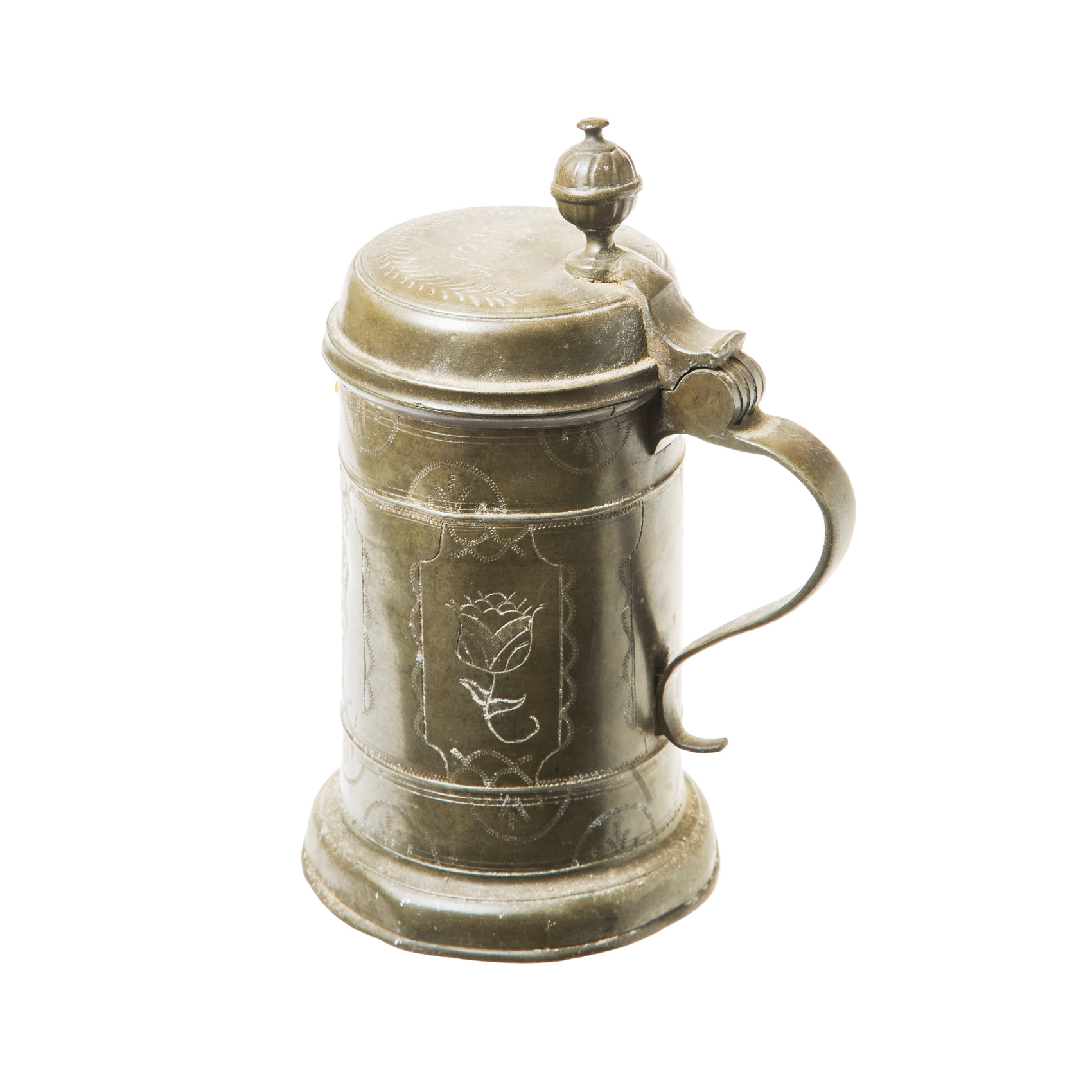 Jarra de cerveza en estaño patinado con decoraciones grabadas y cinceladas de personajes y cenefas, s.XIX.