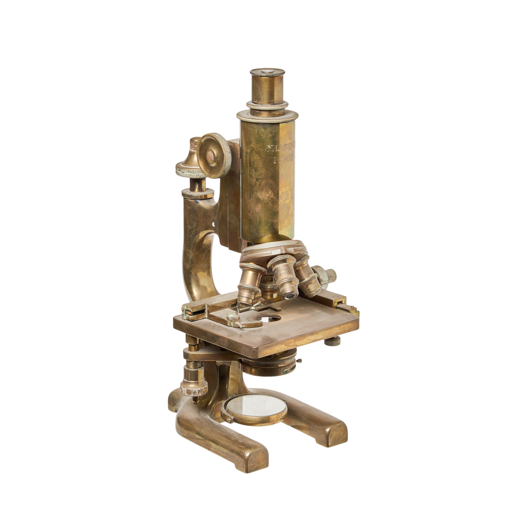 Microscopio francés de la manufactura parisina Stiassnie en latón dorado, ppios. del s.XX.