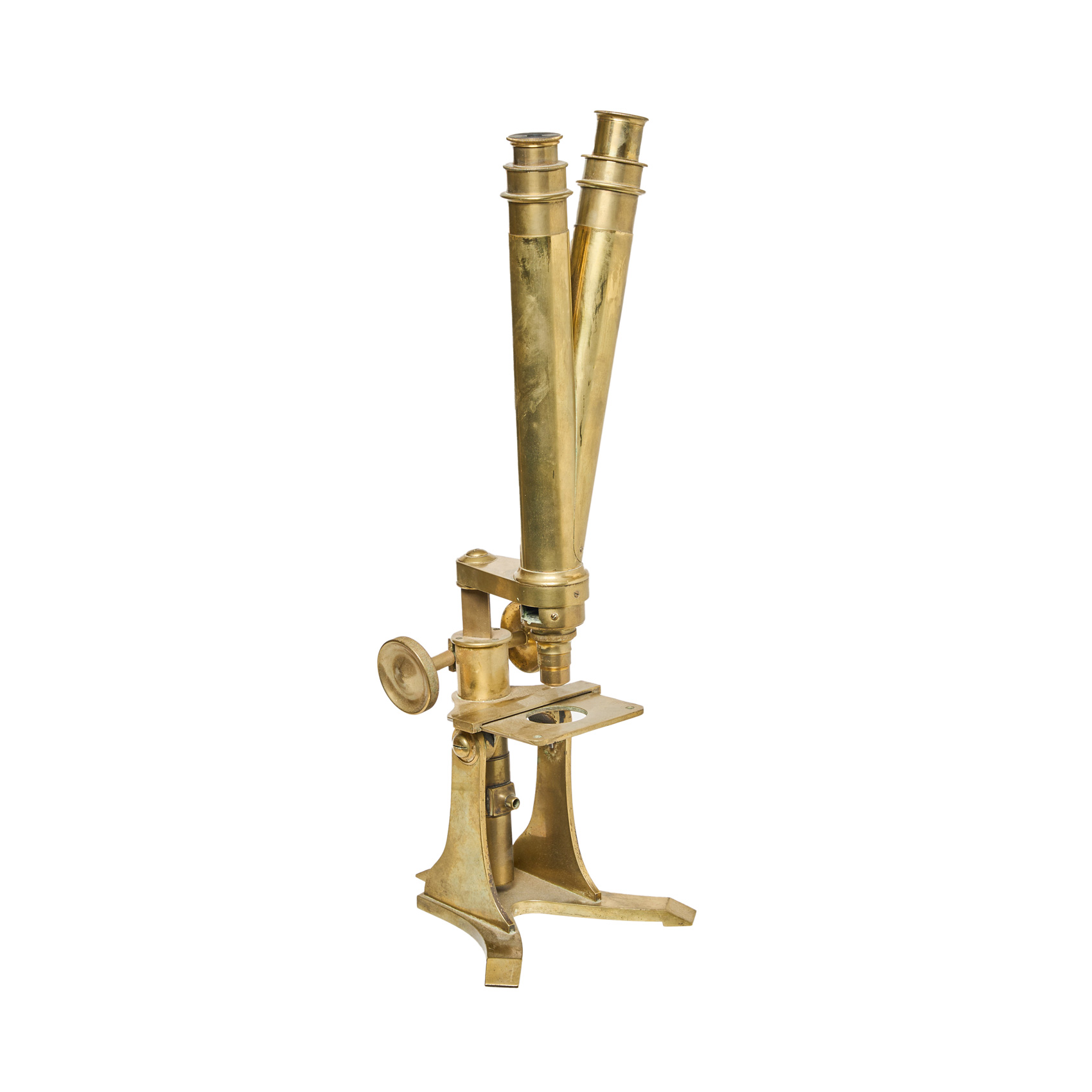 Microscopio inglés de la manufactura londinense Stereoscope and Photographic Company en latón dorado, ppios. del s.XX.