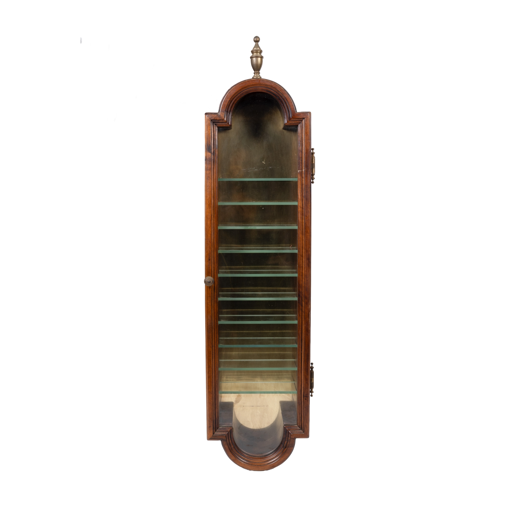 Vitrina expositora de pared en madera de caoba con baldas en cristal y puerta batiente con cierre magnético, mediados del s.XX.