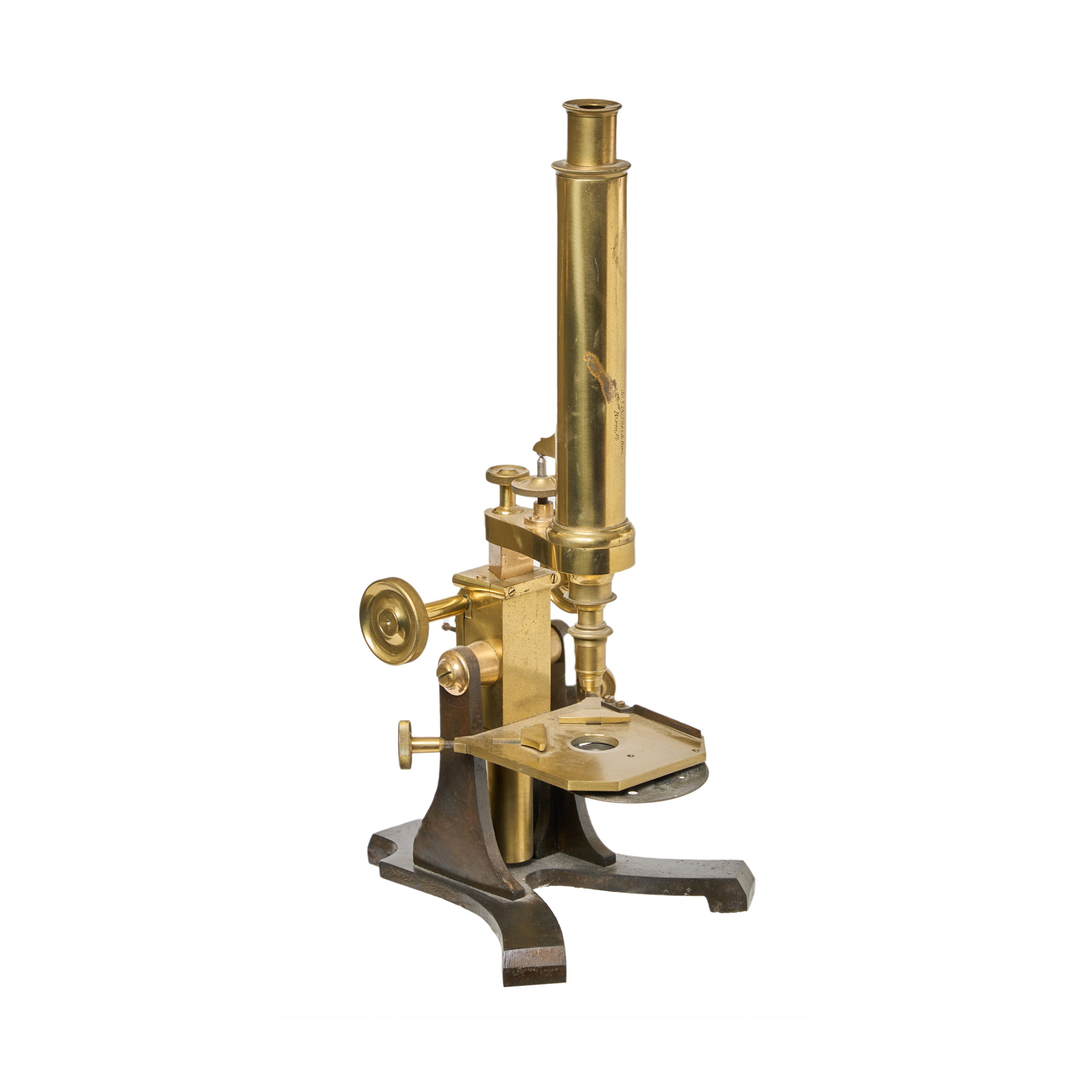 Microscopio inglés de la manufactura James Parkes & Son, Birmingham, en latón dorado y hierro, ppios. del s.XX.