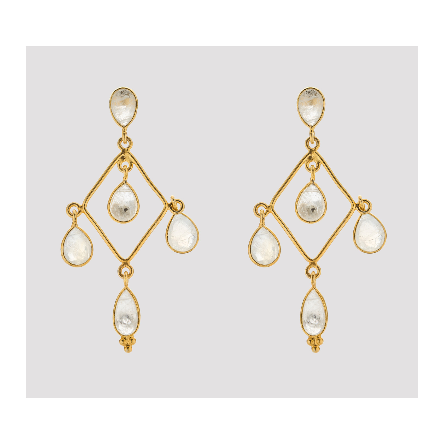 Pendientes largos en plata vermeill con cuentas de piedra luna talla perilla engastadas en chatón.
