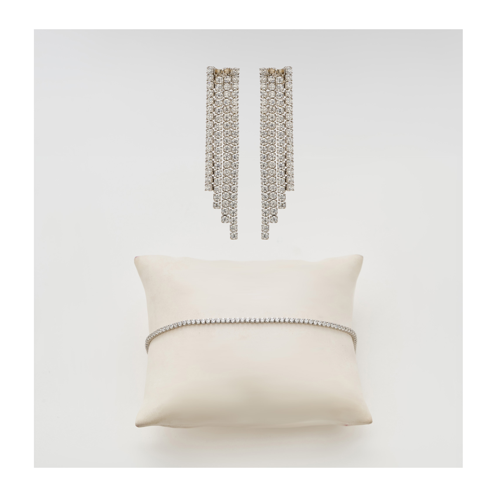 Pulsera rivière y pendientes largos de cuatro tiras en degradé en plata con circonitas talla redonda.