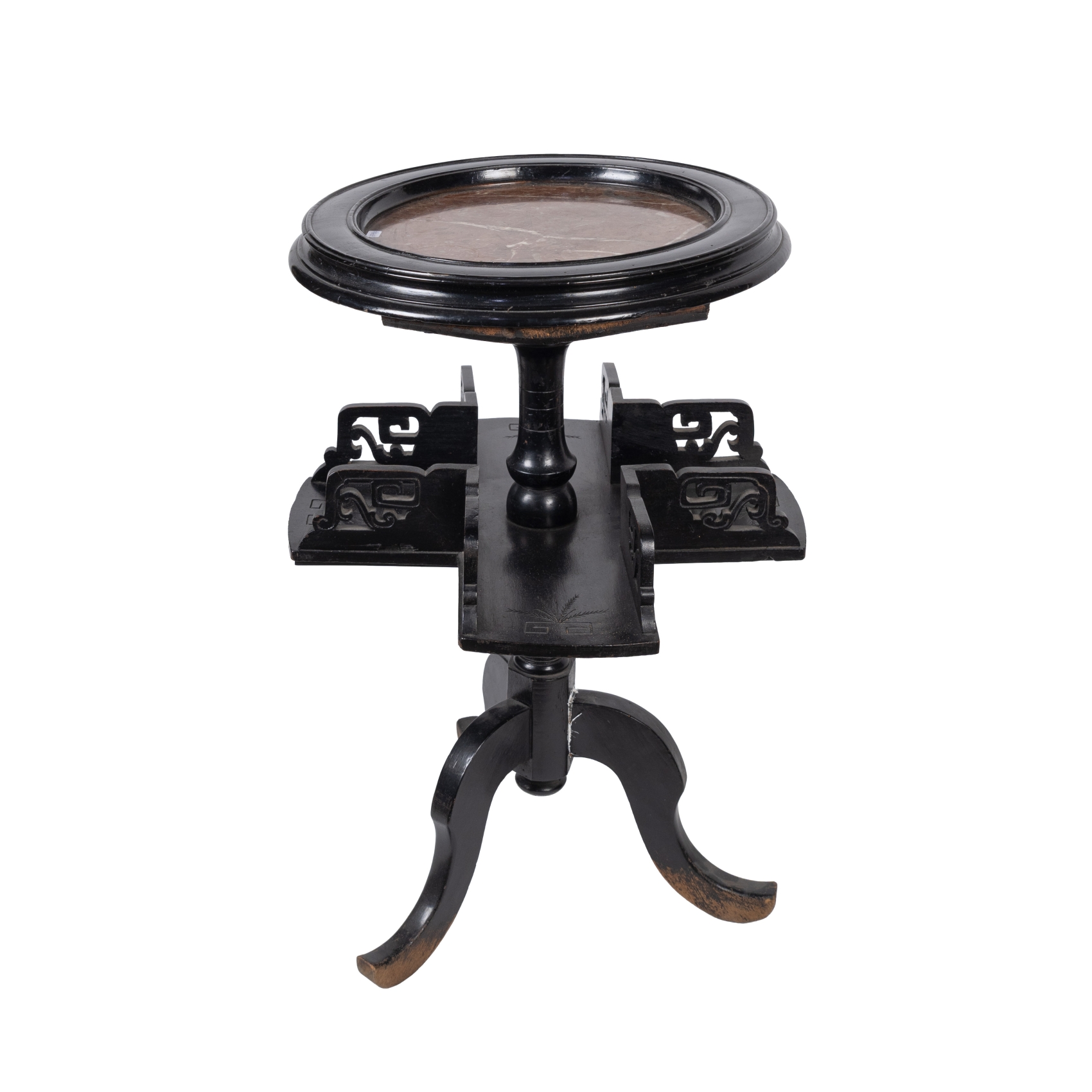 Mesita velador en madera ebonizada de estilo oriental con revistero inferior, pie en trípode y sobre en mármol rojo veteado, fles. del s.XIX-ppios. del s.XX.