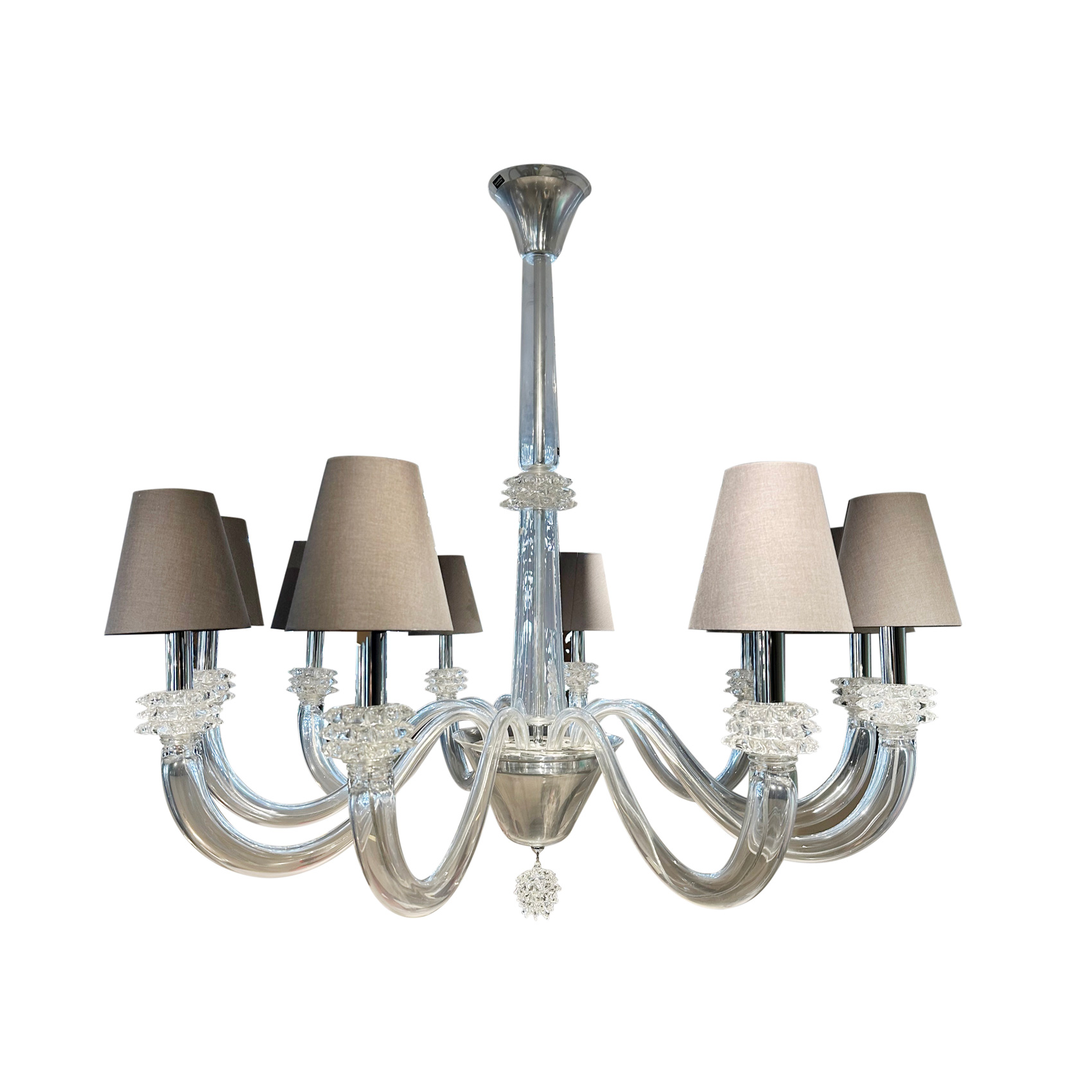 Lámpara de araña modelo «Amsterdam» de diez brazos en cristal de Murano con tulipas tapizadas en tonalidad gris oscuro. Presenta etiquetas de origen.
