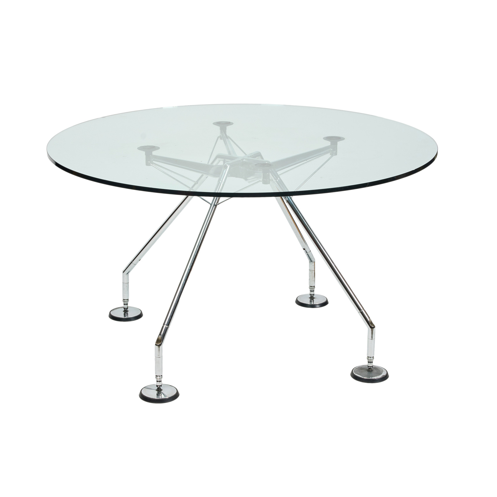 Mesa modelo «NOMOS» con estructura esqueleto en metal y aluminio cromado. Sobre en cristal apoyado directamente sobre ventosas acolchadas. Sellos de origen.