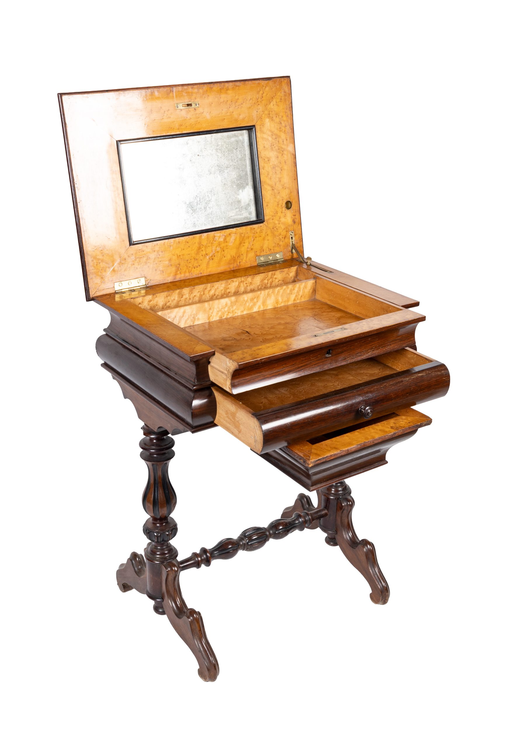 Costurero en madera de caoba tallada y torneada con interior en limoncillo, s.XIX. Interior con espejo, bandeja deslizable y cesta inferior para ovillos. Patas unidas en chambrana.