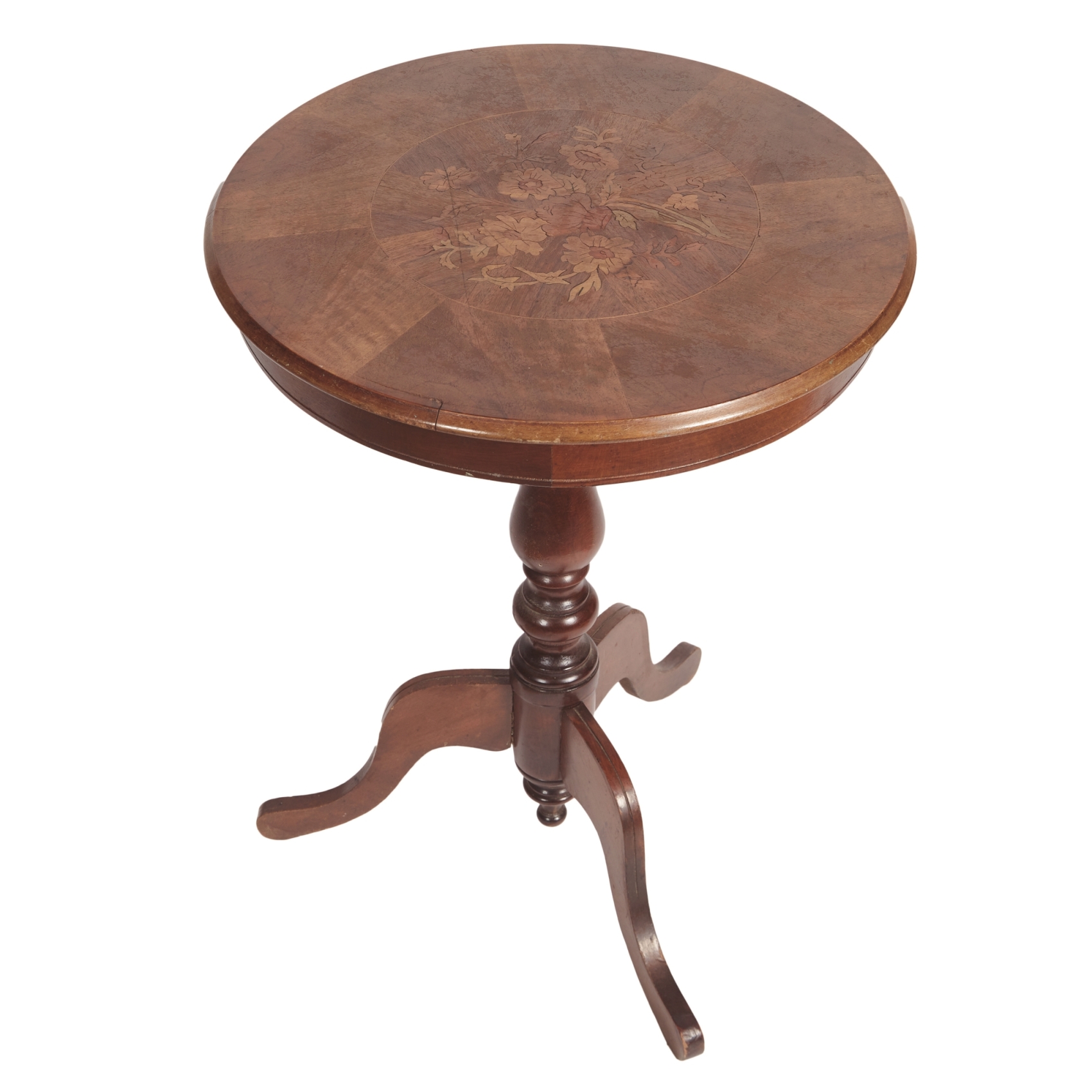 Mesa velador circular en madera de nogal con marquetería floral, fuste abalustrado y tres patas, segundo cuarto del s.XX.