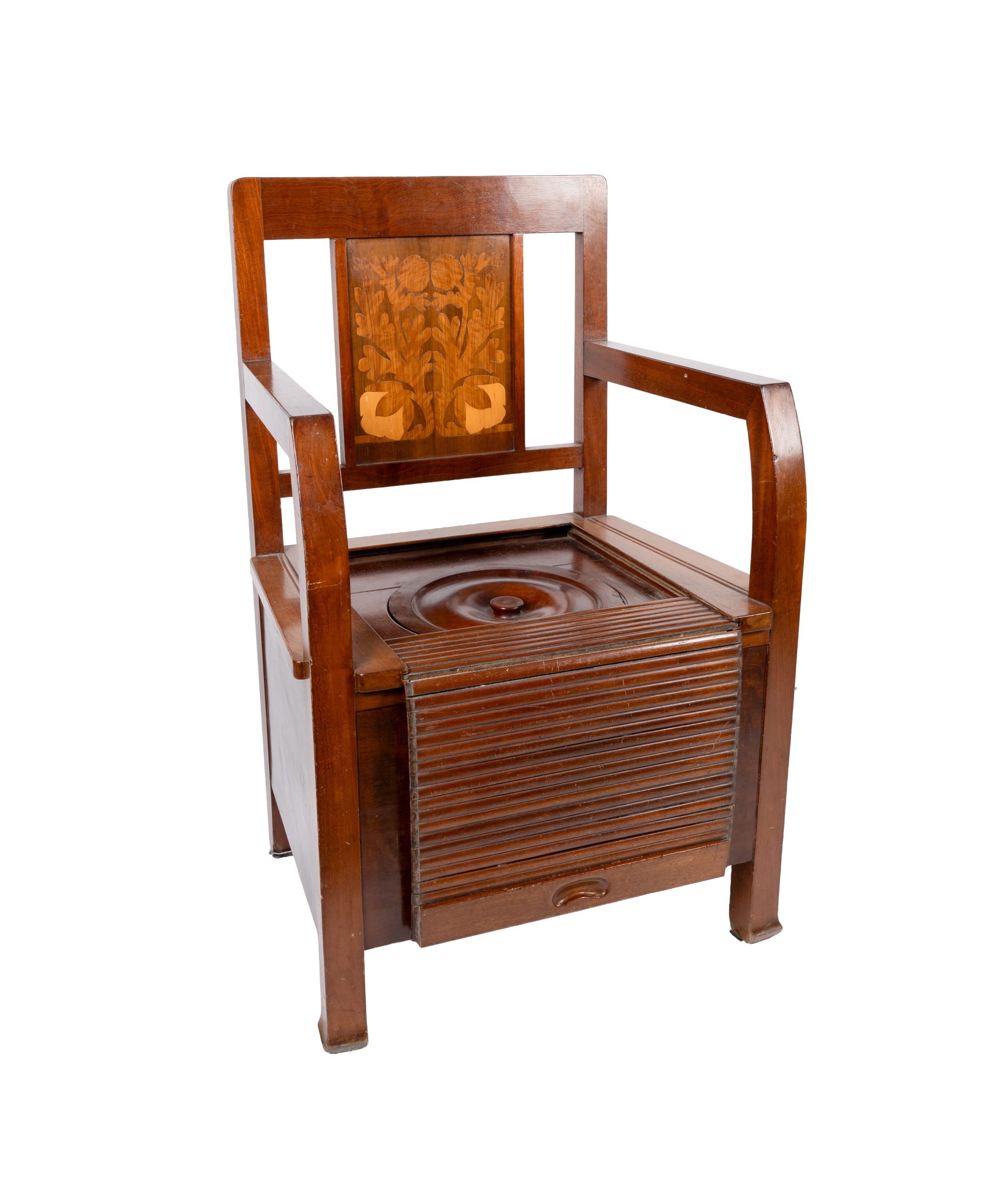 Don Pedro. Mueble inodoro en madera de caoba con asiento de persiana y respaldo con decoración de marqueterías vegetales, s.XIX. Una puerta lateral.
