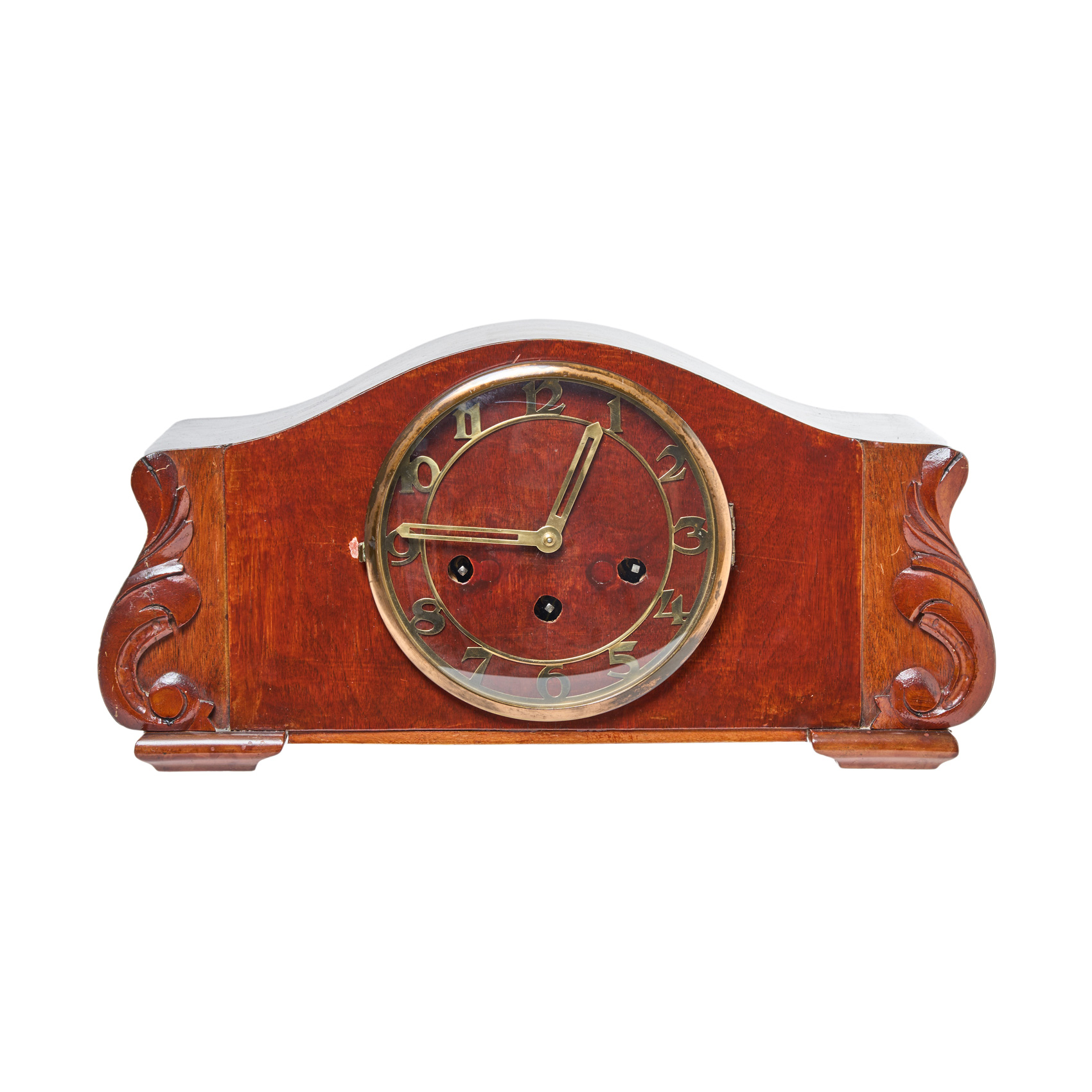 Reloj de sobremesa en madera tallada con esfera de numeración arábiga en metal dorado, primera mitad del s.XX. Maquinaria alemana Aug. Schatz & Sohne con sonería en horas, medias y cuartos. Adjunta llave.