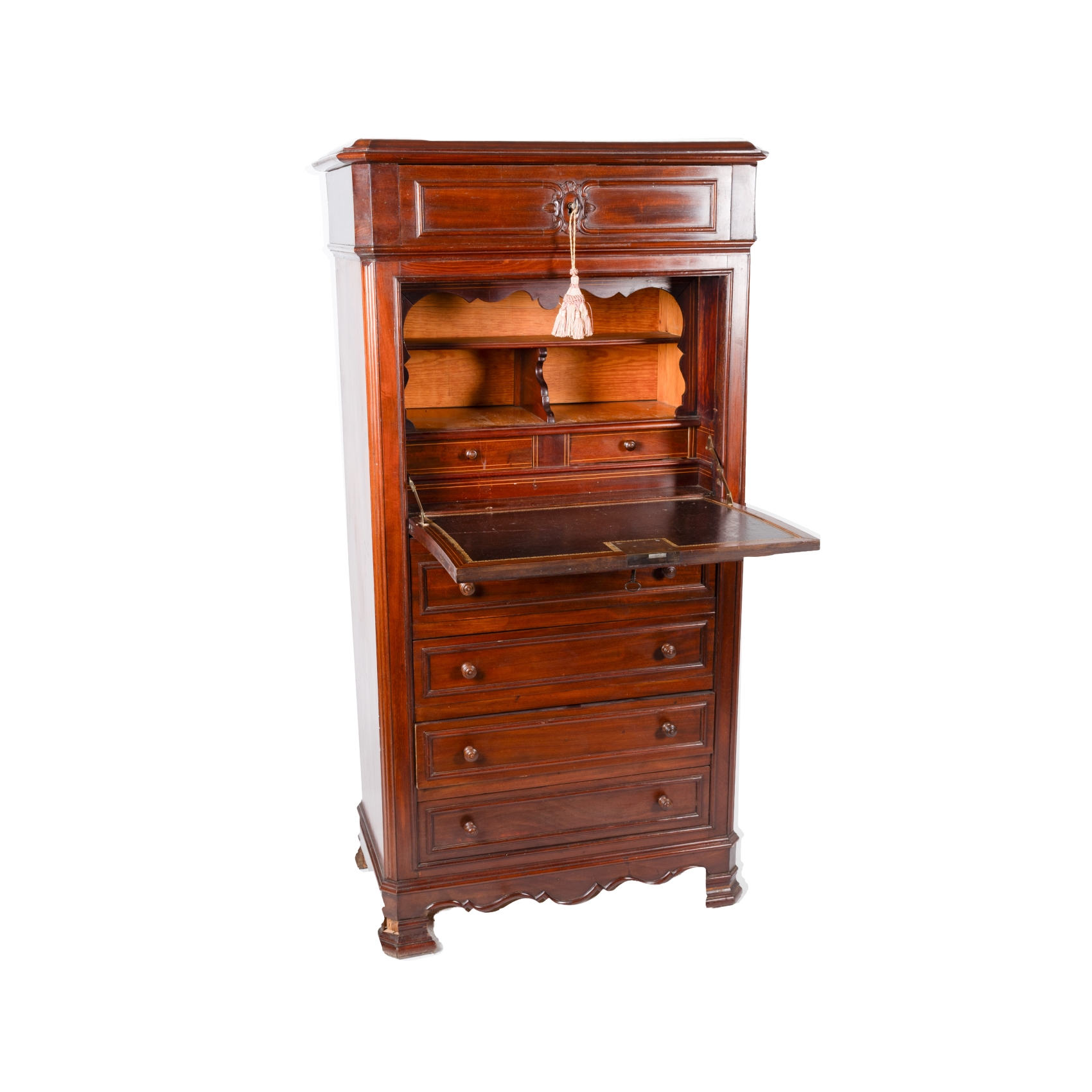 Mueble escritorio en madera de caoba con sobre abatible tapizado en cuero negro e interior con compartimentos y cajones, s.XX. Un cajón superior. Parte inferior con cuatro cajones. Sobre superior en mármol blanco veteado. Adjunta dos llaves.