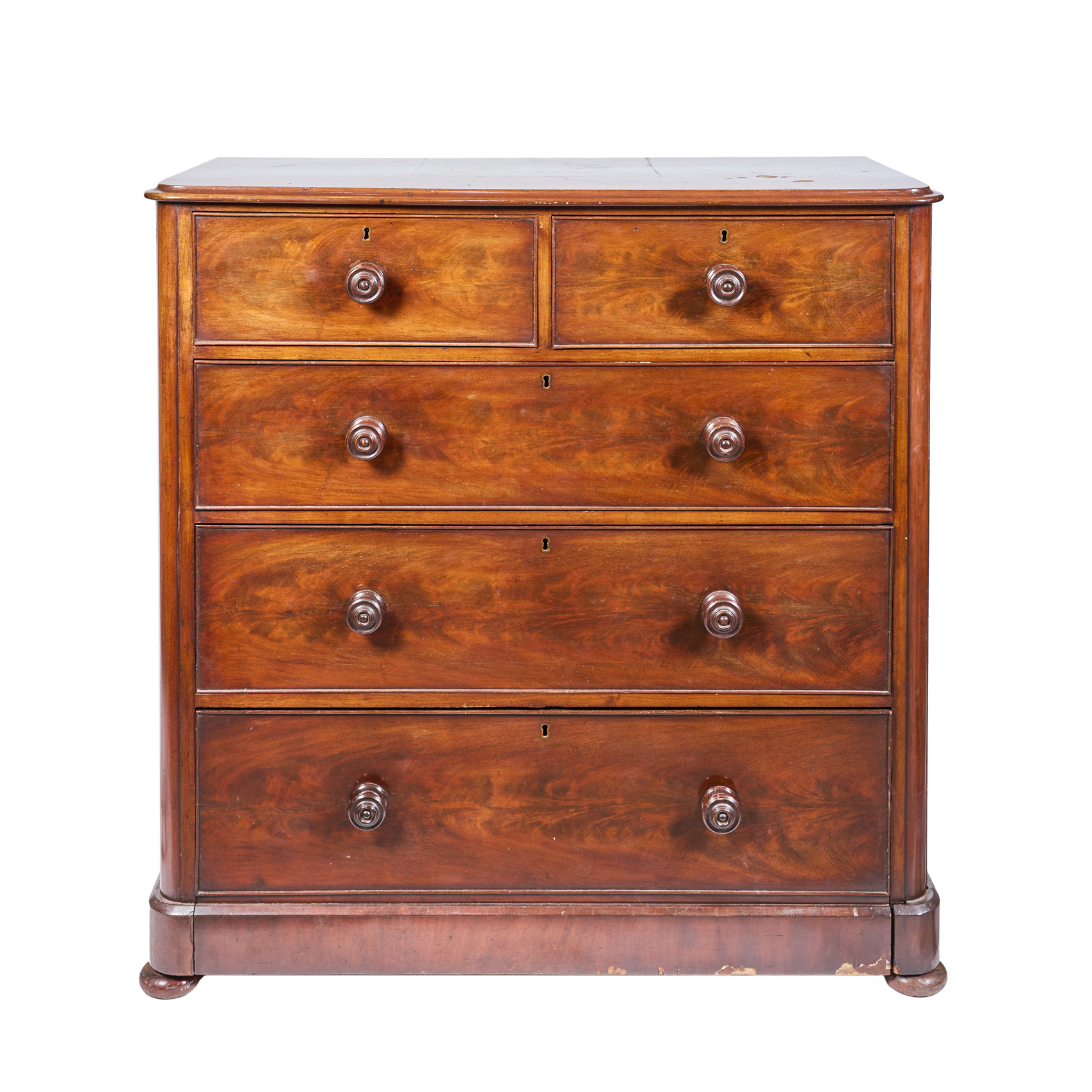 Cómoda inglesa victoriana en madera de caoba con cinco cajones al frente, los dos superiores cortos, s.XIX.