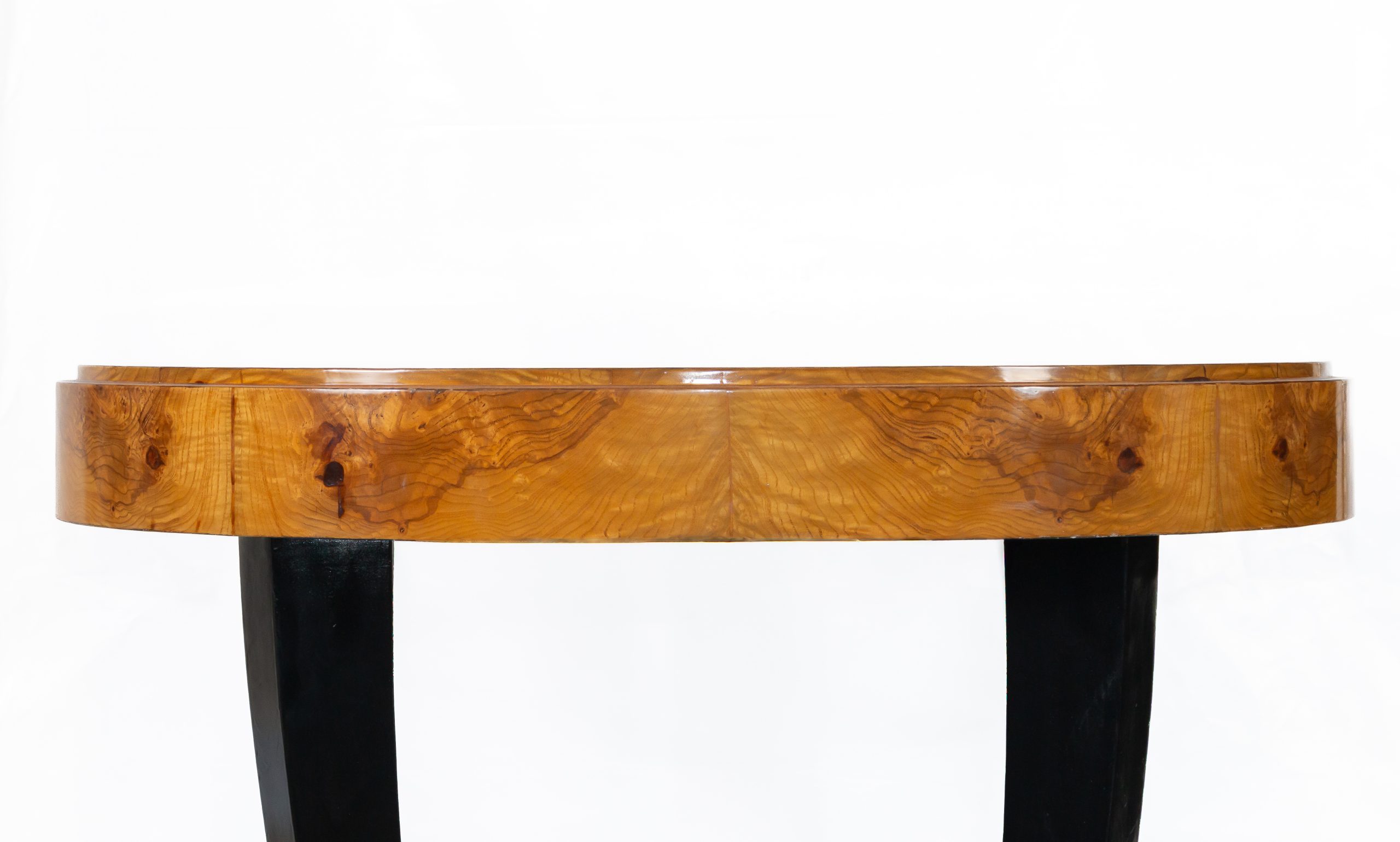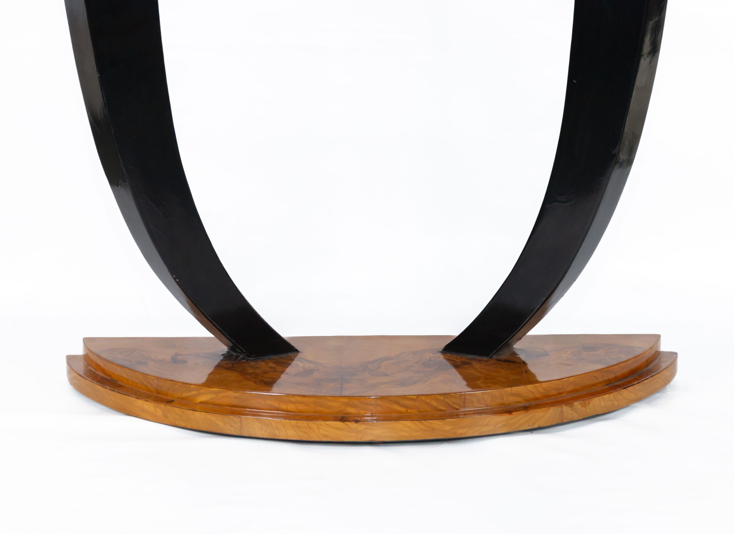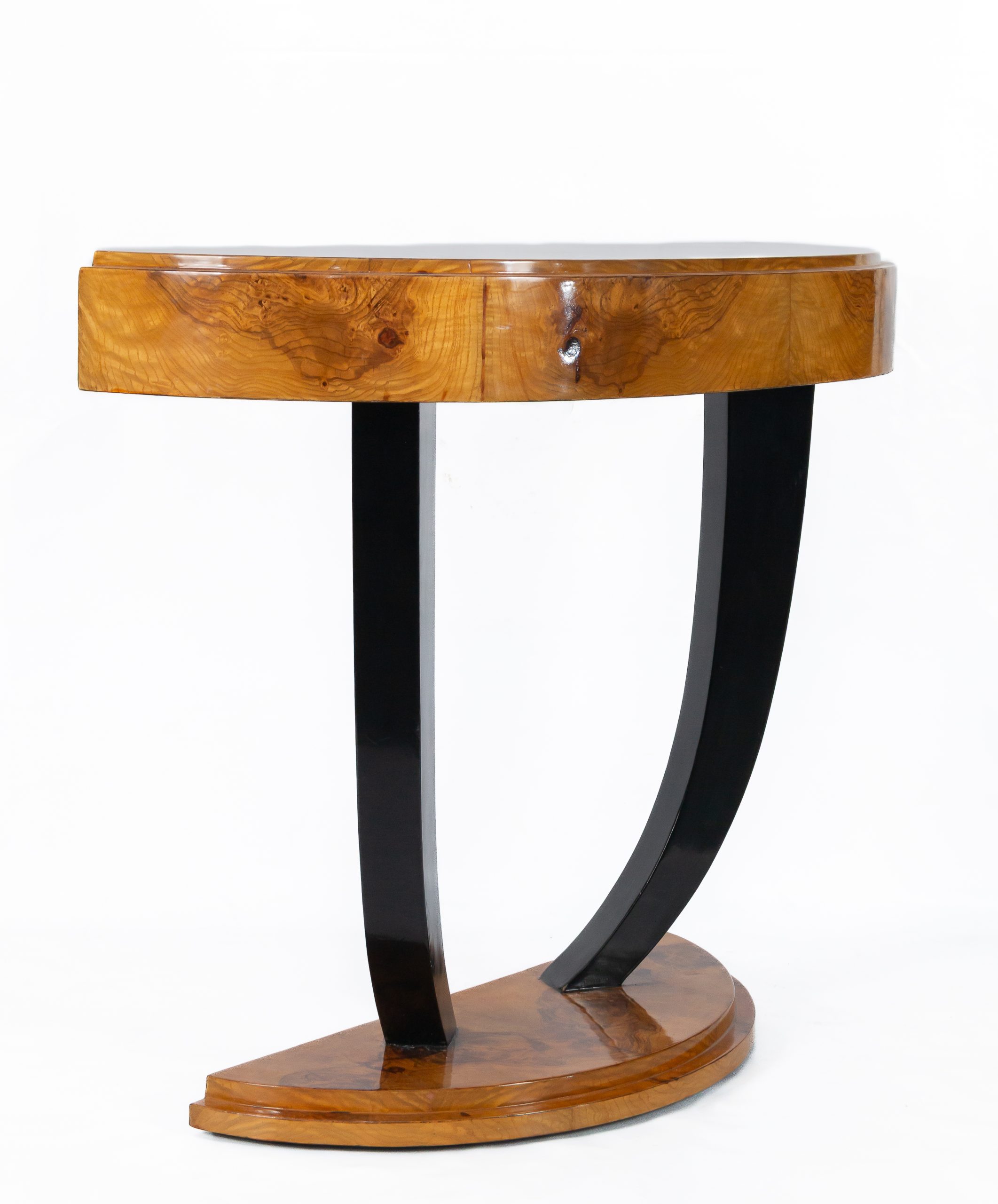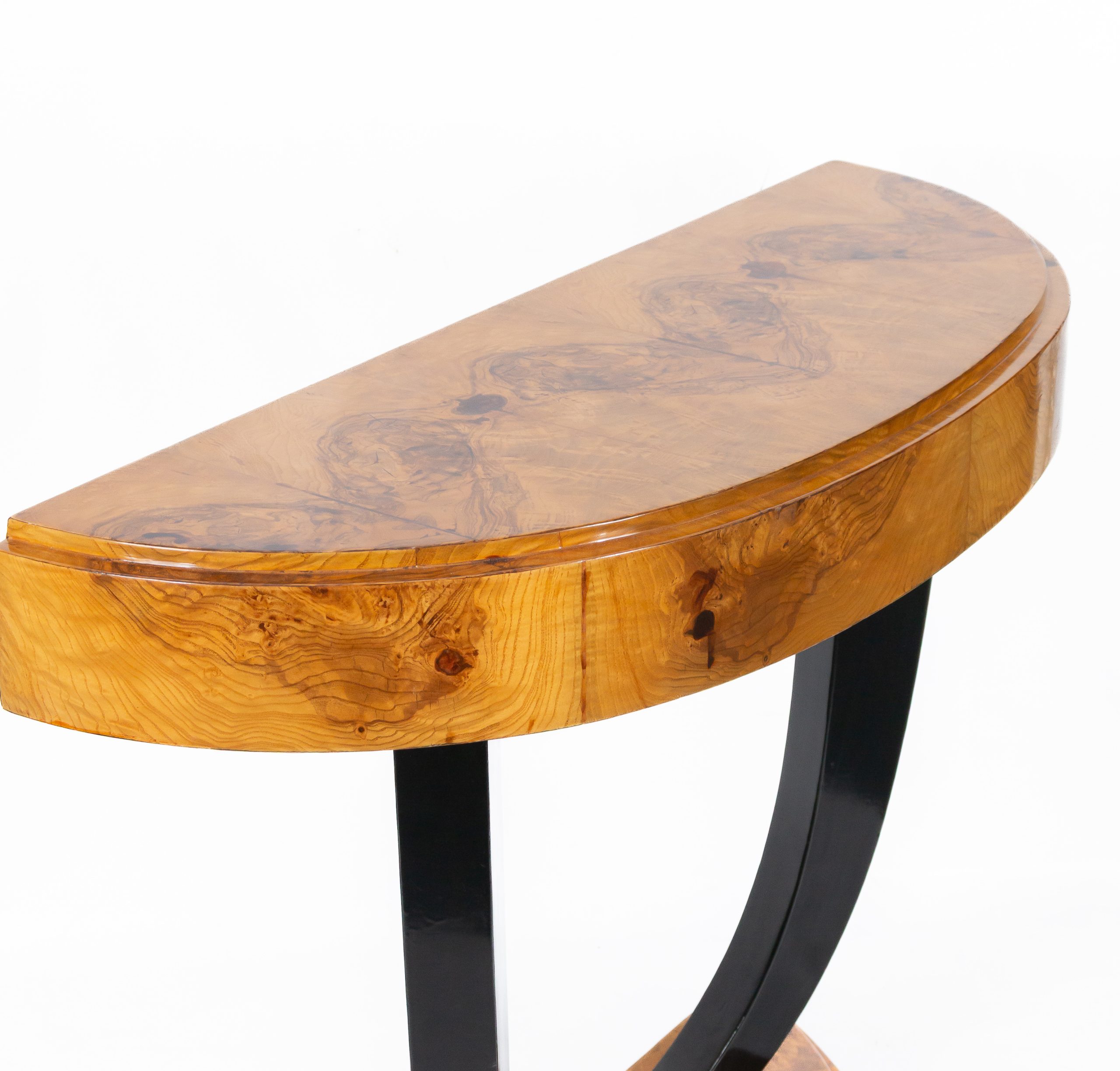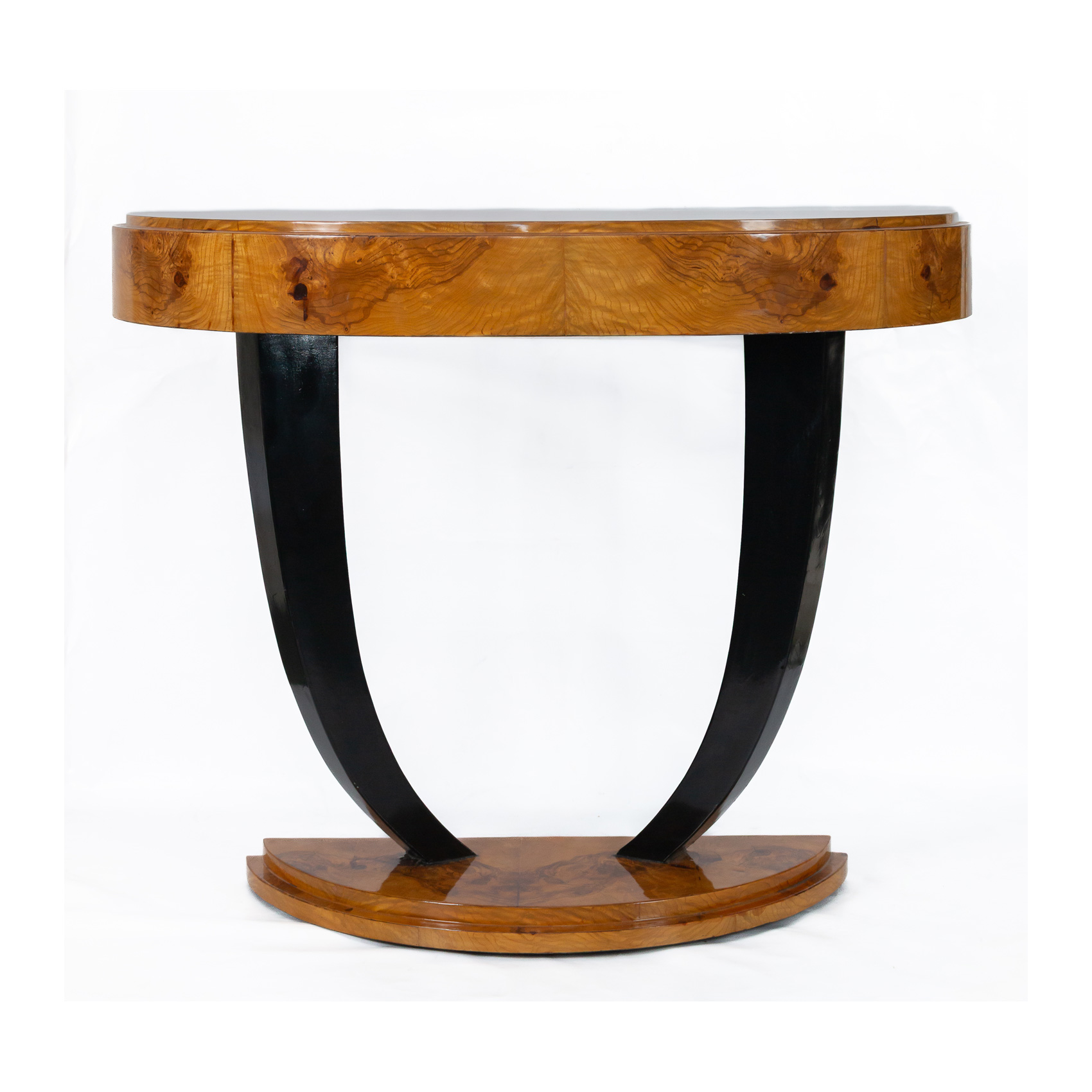 Consola estilo Art Deco en madera chapada de raíz y madera ebonizada con sobre de media luna y patas estilizadas ligeramente curvadas, s.XX.