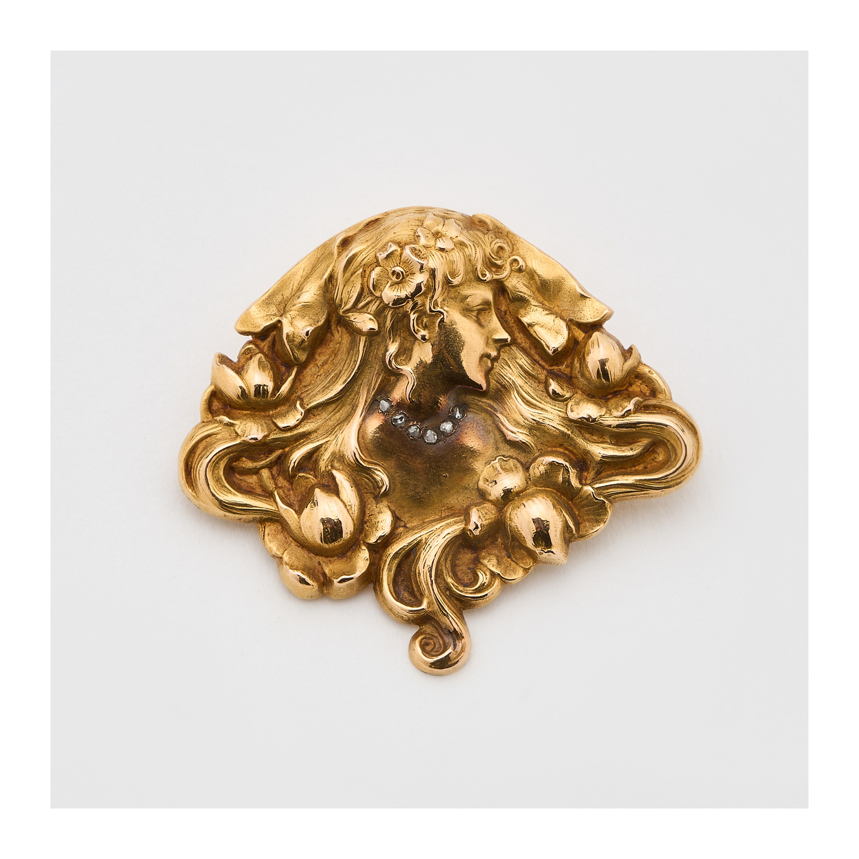 Broche Art Nouvea en oro y diamantes talla rosa con decoración floral y vegetal representando perfil femenino, c.1910.