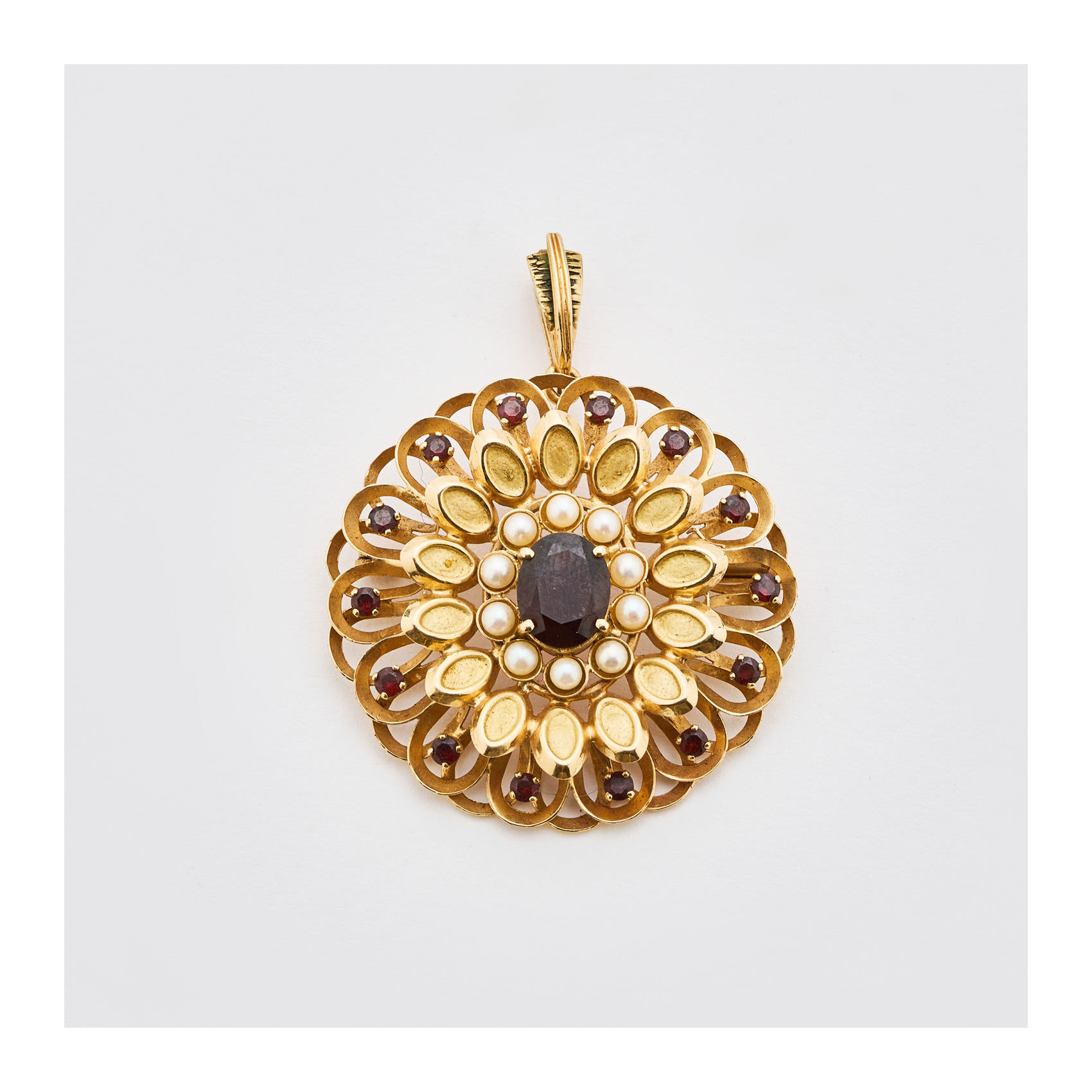 Broche – colgante diseño redondo en oro bicolor mate y brillo con centro y orla calada de granates tallas oval y redonda y perlas cultivadas de 2 mm.