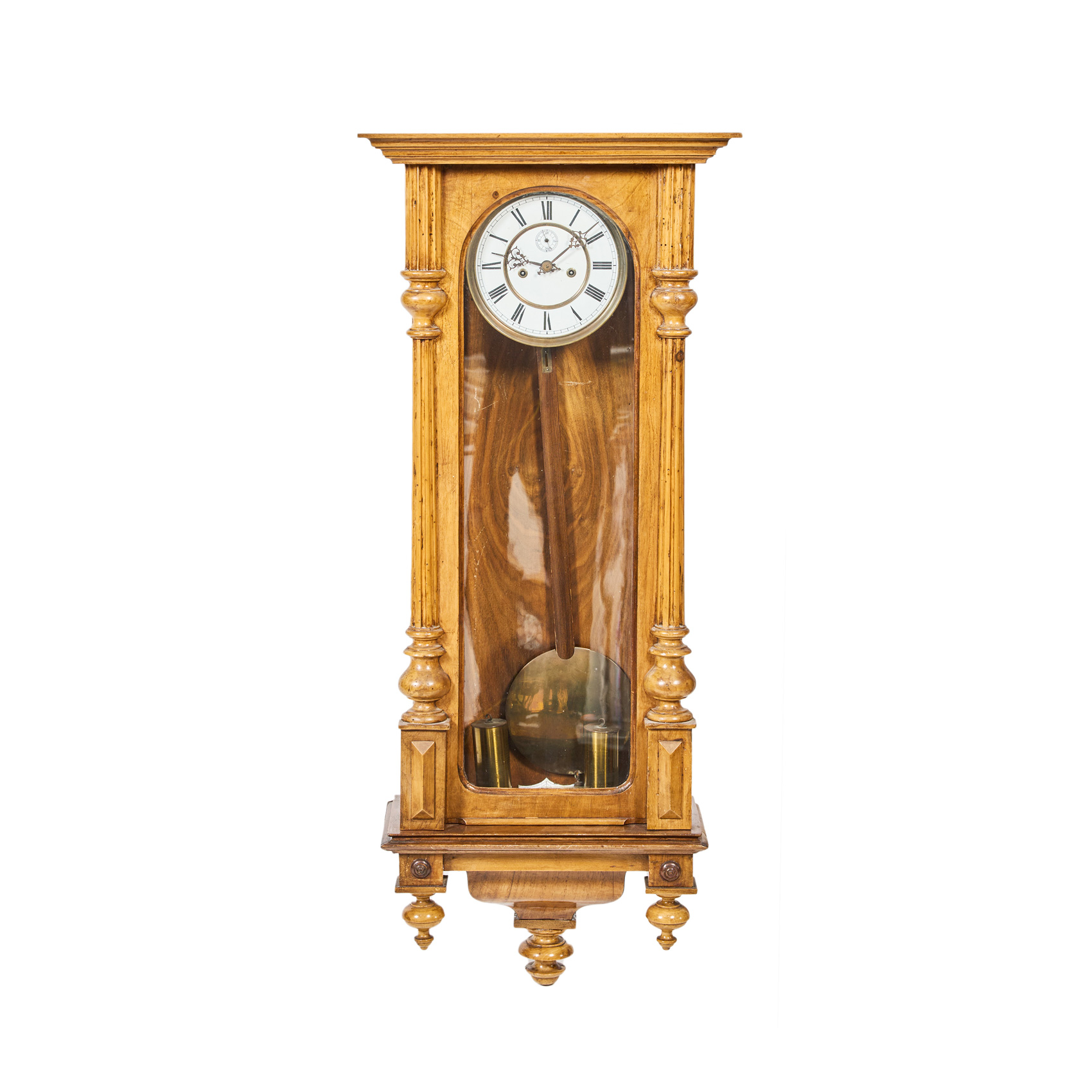 Reloj de pared en madera con esfera en porcelana, c.1900. Esfera con numeración romana con sonería de horas y medias. Presenta péndulo y pesas. Precisa repaso.