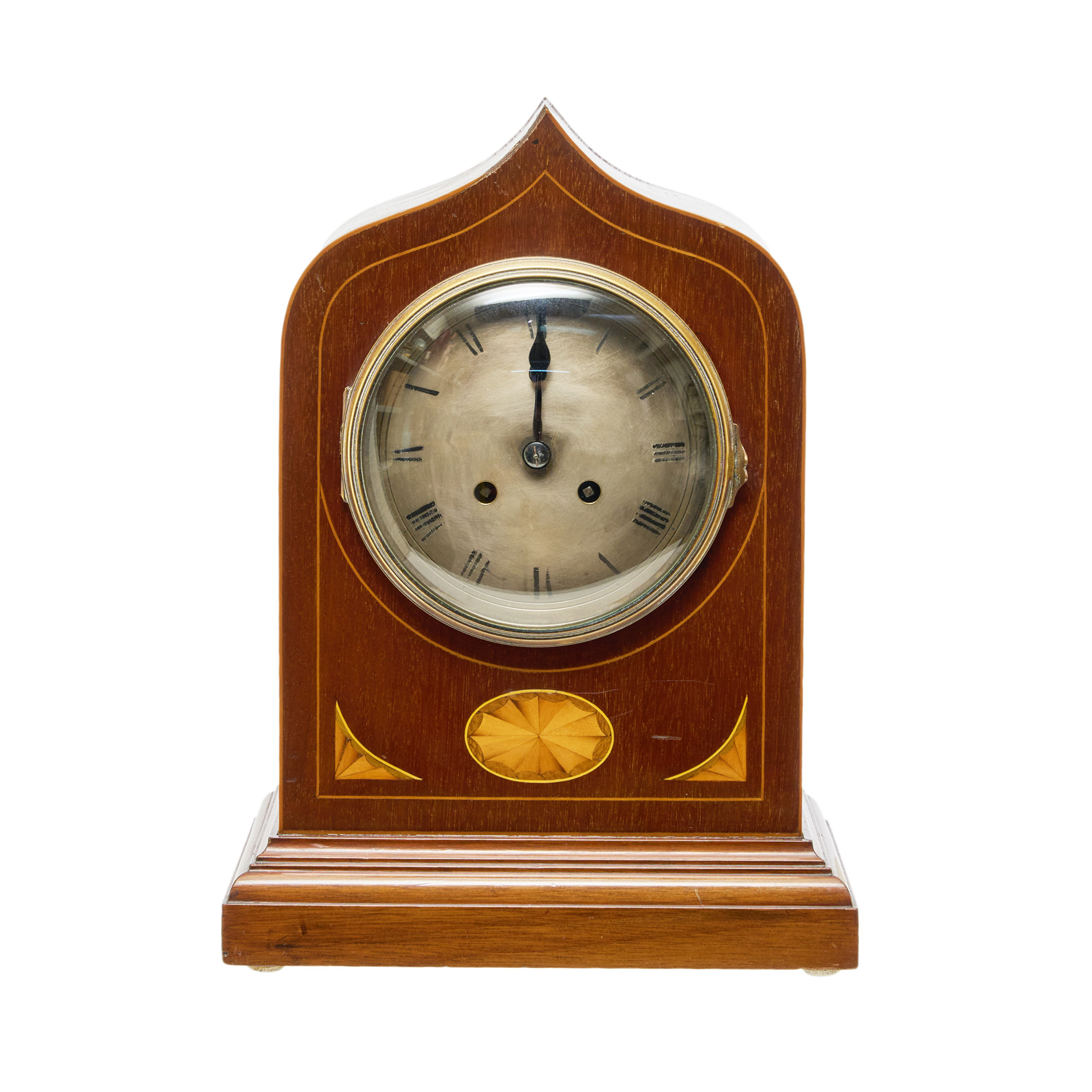 Reloj inglés de sobremesa en madera de caoba con marqueterías de maderas frutales, primer cuarto del s.XX. Esfera en metal con numeración romana. Maquinaria París con sonería de horas medias. Adjunta péndulo. Sin llave.