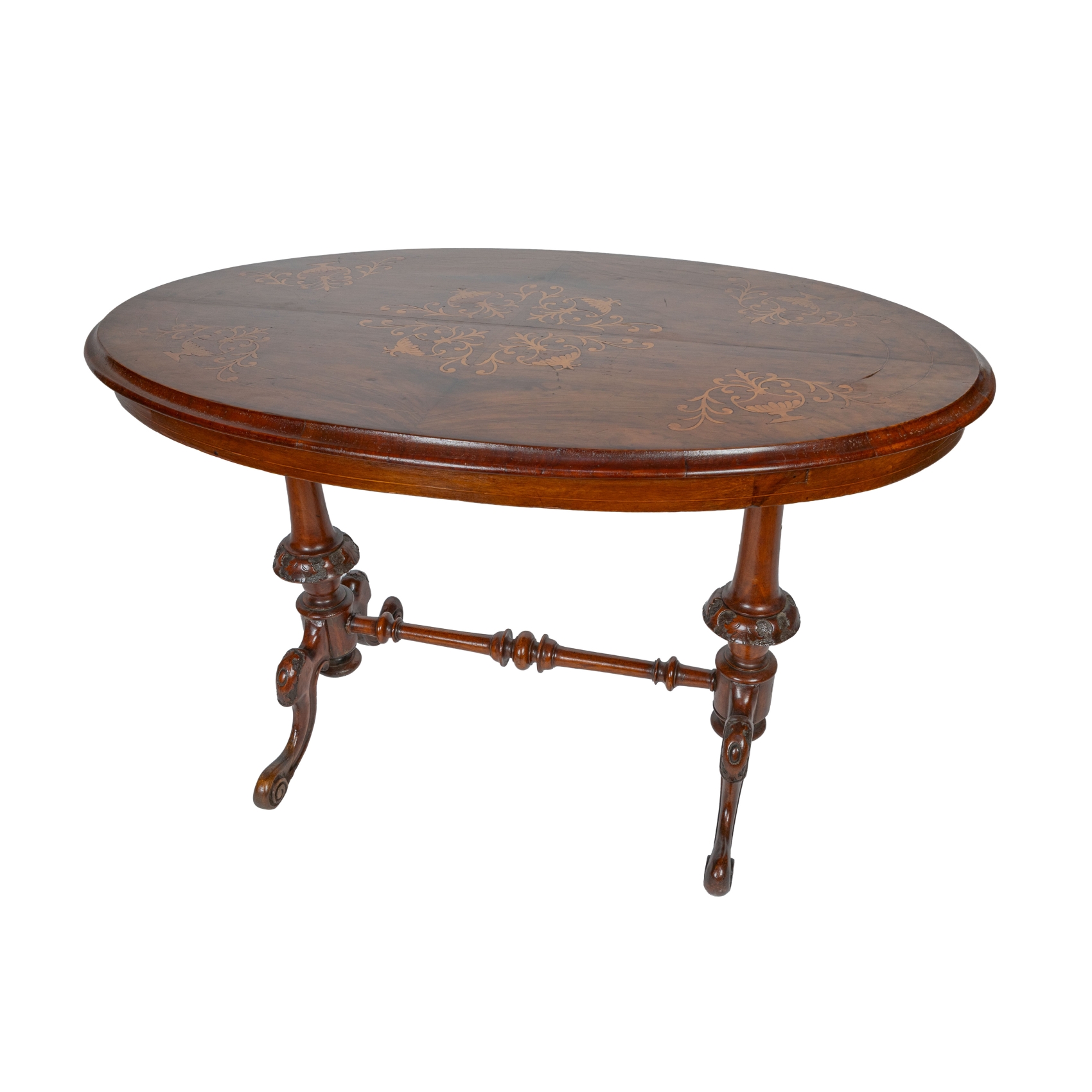 Mesita velador oval en madera de raíz de nogal con marqueterías florales en boj, fles. del s.XIX. Patas unidas en chambrana.