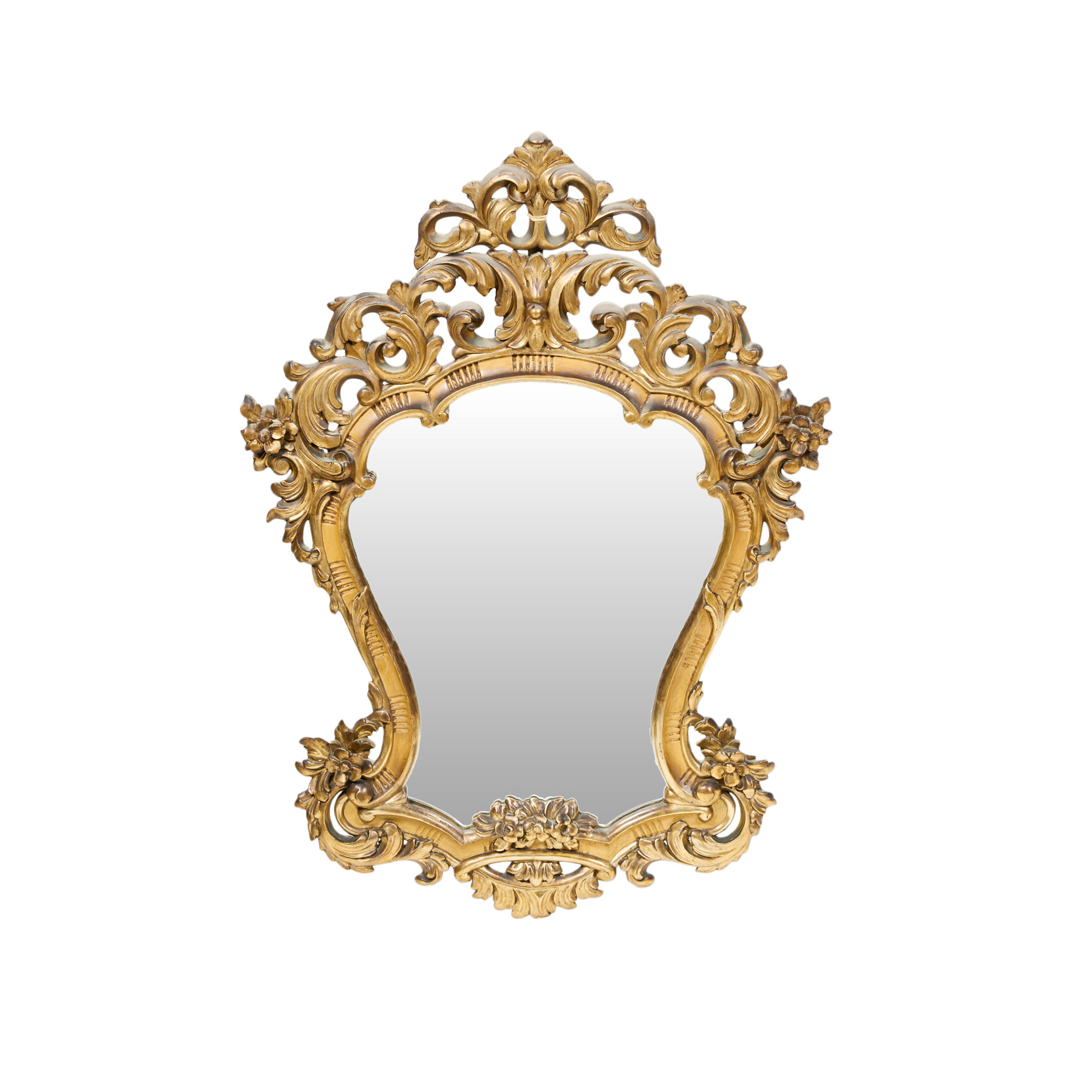 Espejo cornucopia en madera tallada y dorada con profusa decoración de roleos y motivos florales, s.XIX.