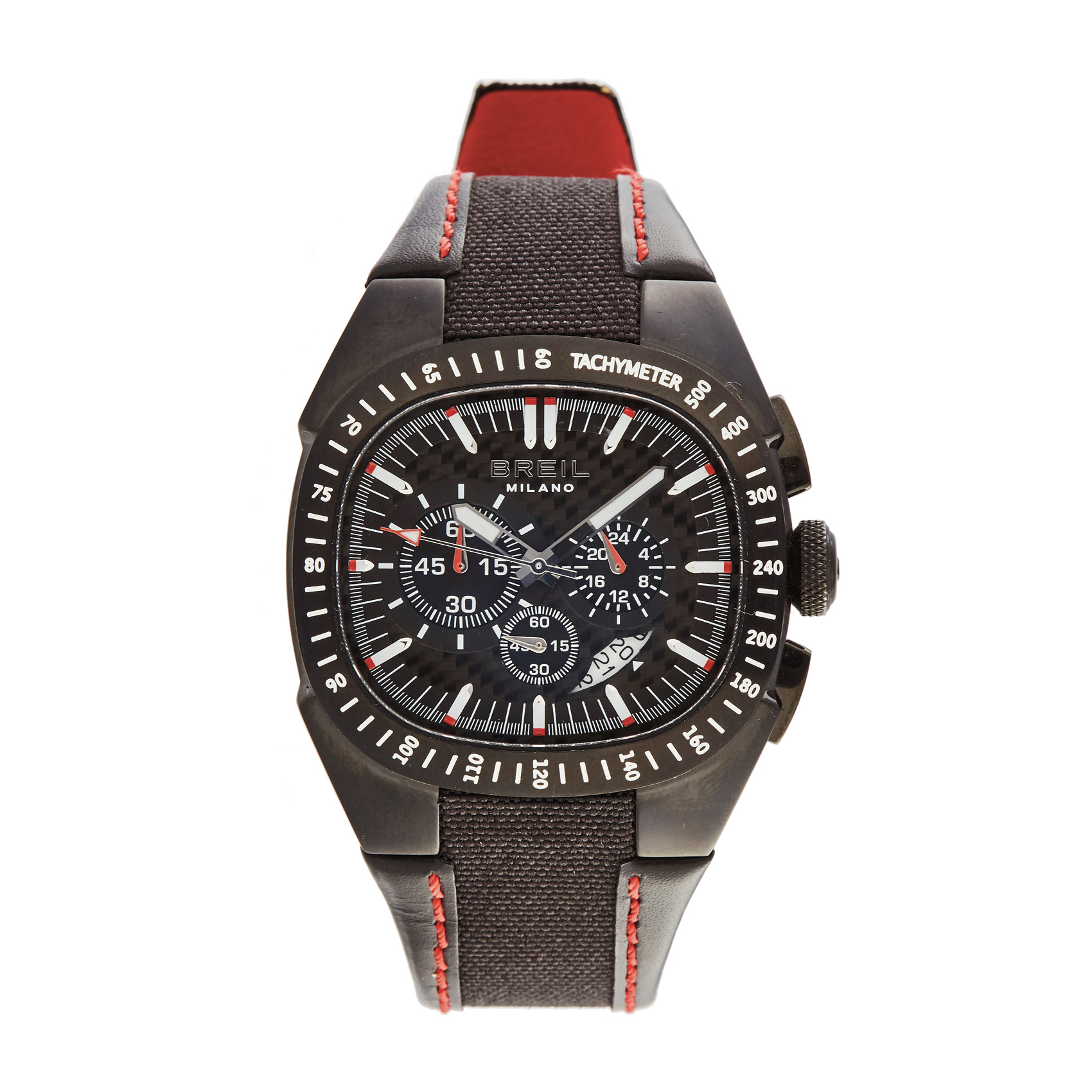 Reloj Breil de pulsera para caballero. En acero pavonado y correa de piel. Esfera negra con numeración a trazos aplicados y tres esferas complementarias. Calendario fecha entre 4 y 5. Cronómetro. Mecanismo de quartz.