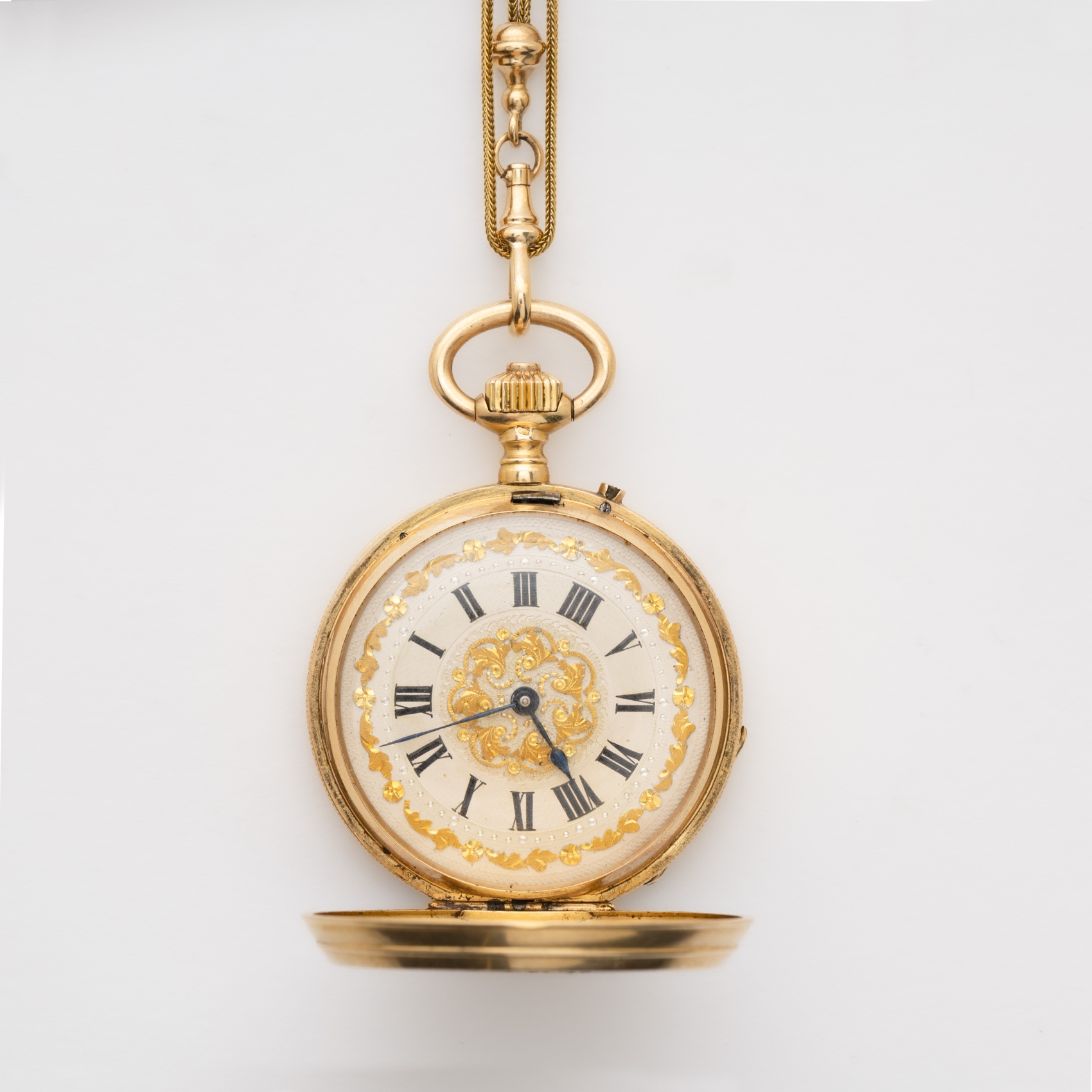 Reloj de bolsillo saboneta de oro con tres tapas, esmalte y diamantes S.XIX. Esfera de porcelana con numeración romana, numerado 75707.