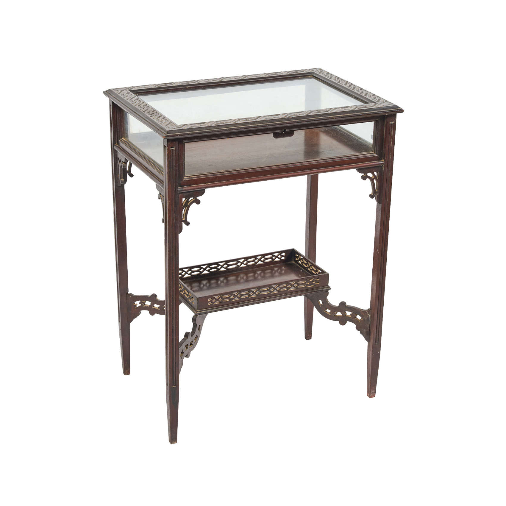 Mesita expositora con sobre acristalado abatible en madera de caoba con motivos geométricos tallados, c.1900. Patas unidas por chambrana con estante.