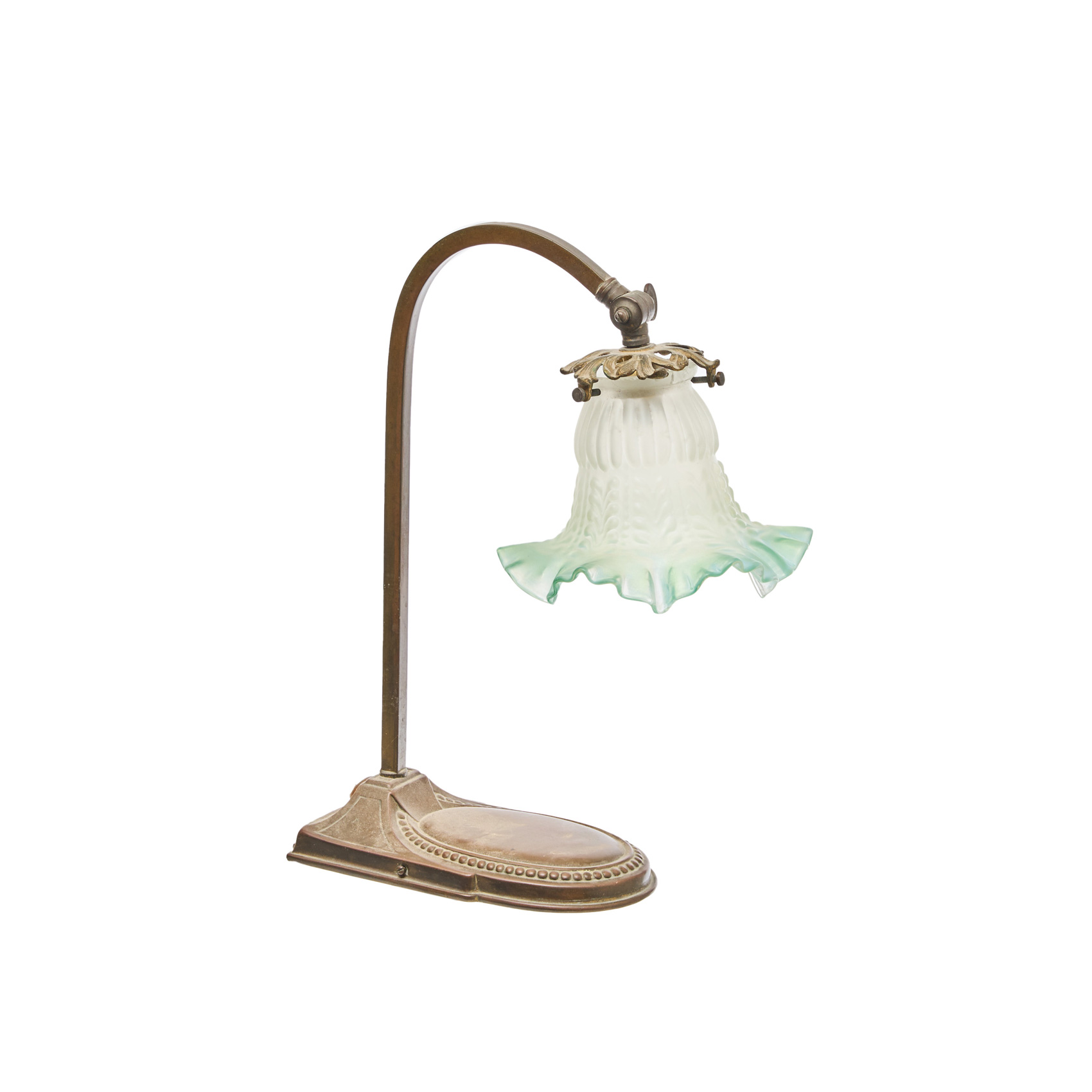 Lámpara de sobremesa regulable en metal patinado, c.1920. Tulipa en cristal moldeado de tonalidad translúcida y verde.