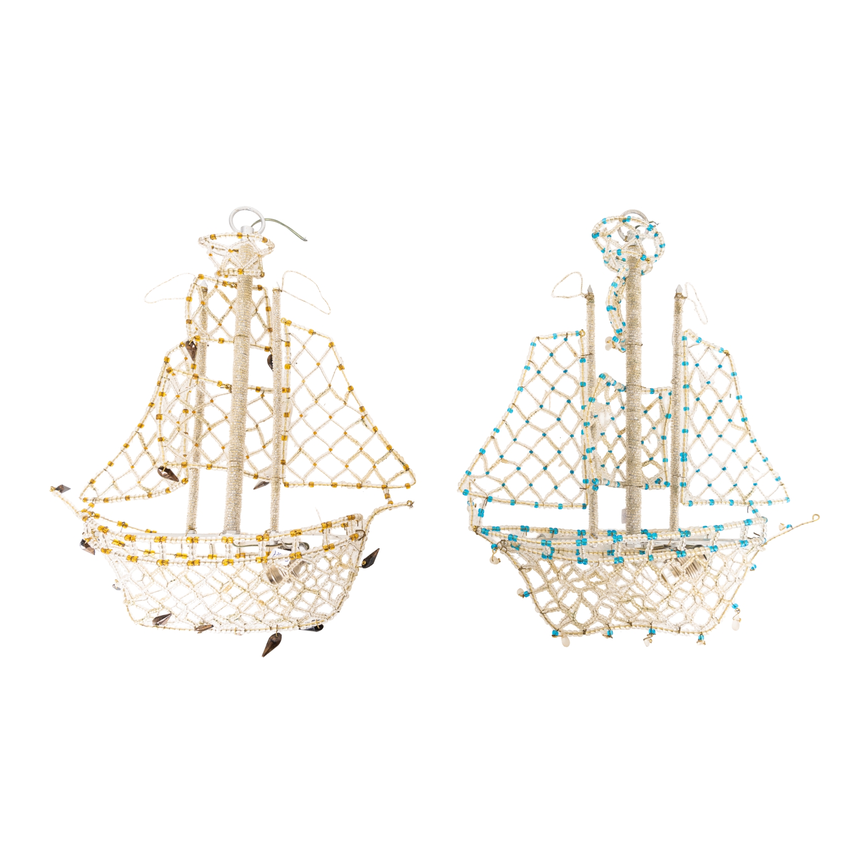 Pareja de lámparas de techo con forma de barco en hilo de alambre y cuentas de cristal de tonalidades translúcidas, ámbar y azul, segunda mitad del s.XX.
