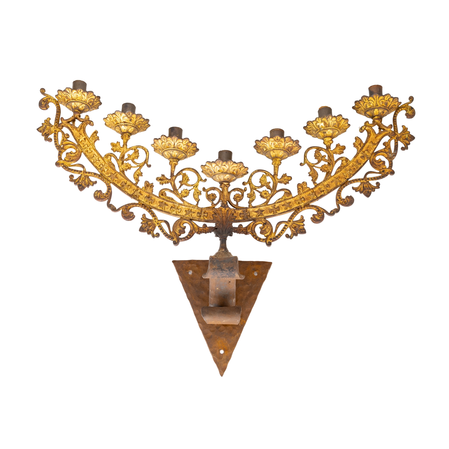 Aplique de pared de siete luces en metal dorado con decoración calada de rocallas y motivos florales, primera mitad del s.XX. Electrificado.