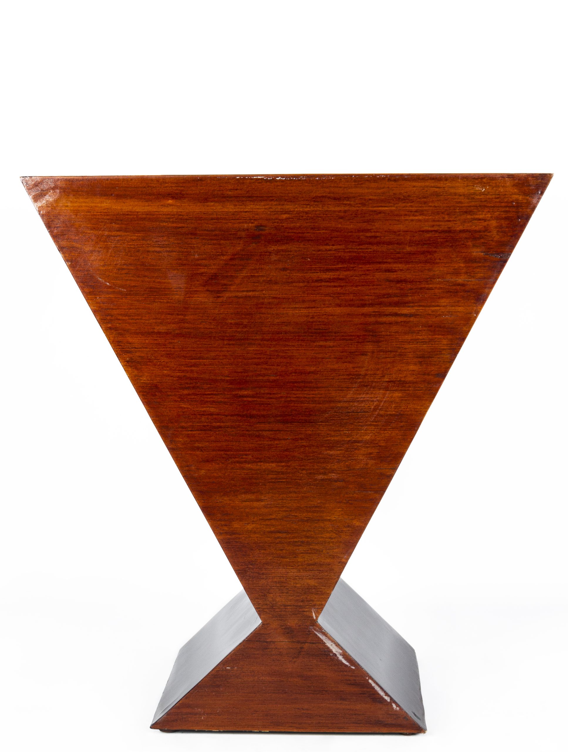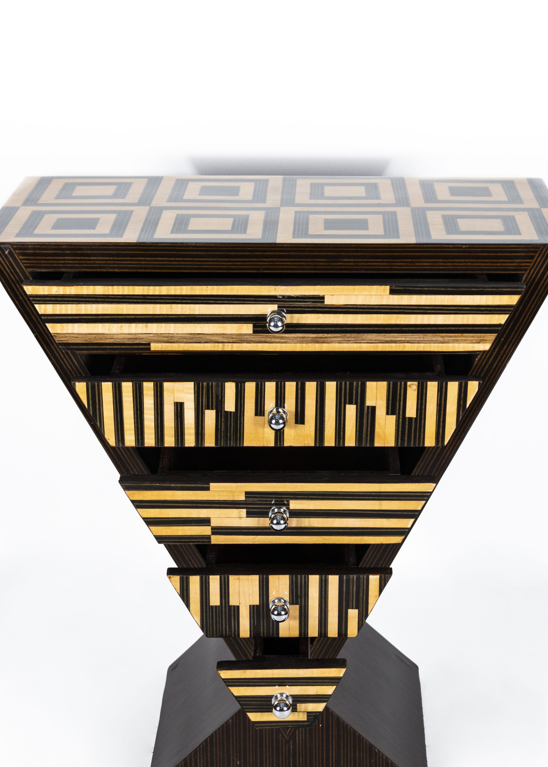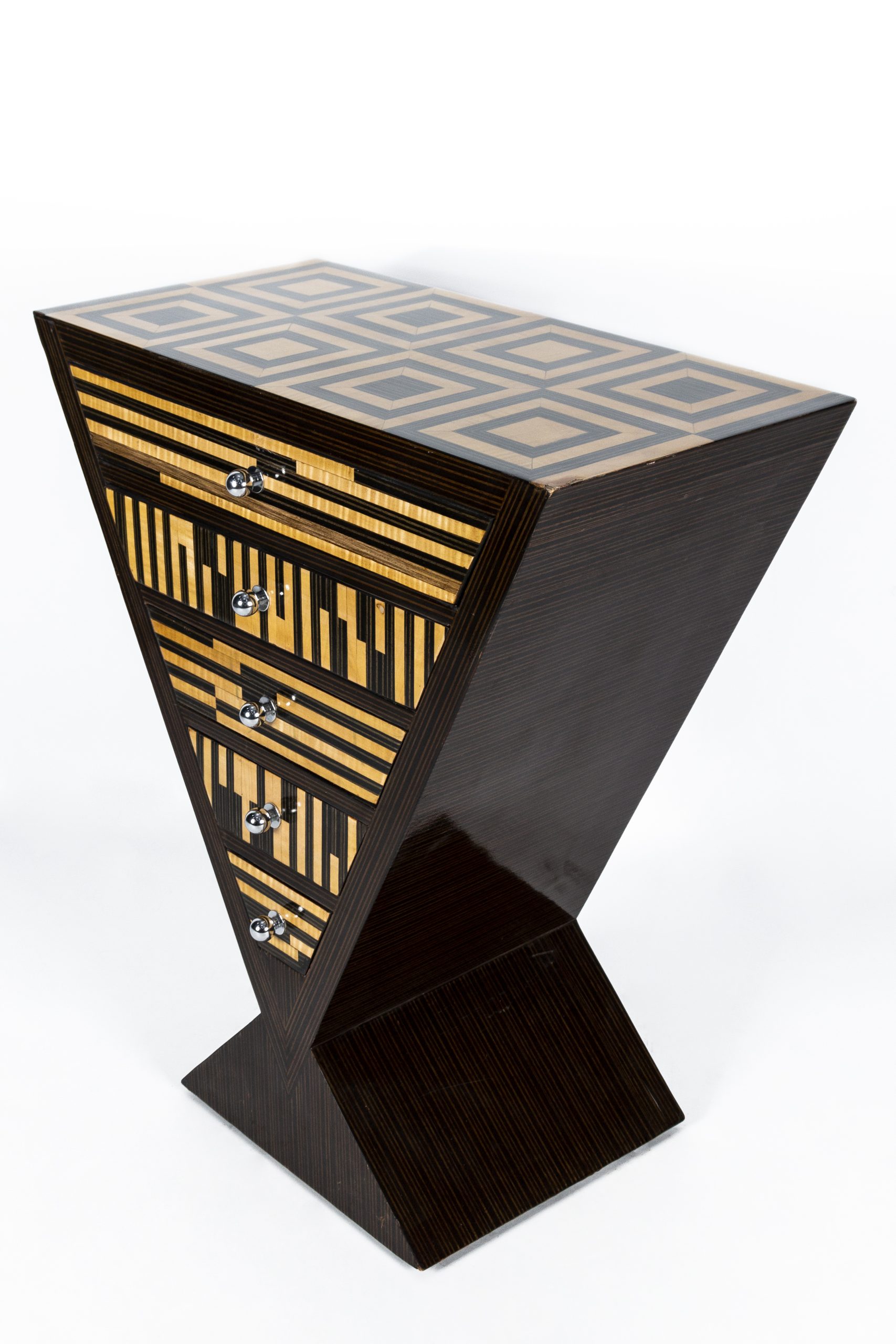 Cajonera triangular en madera chapada con acabado en marqueterías geométricas contrastadas, s.XX.