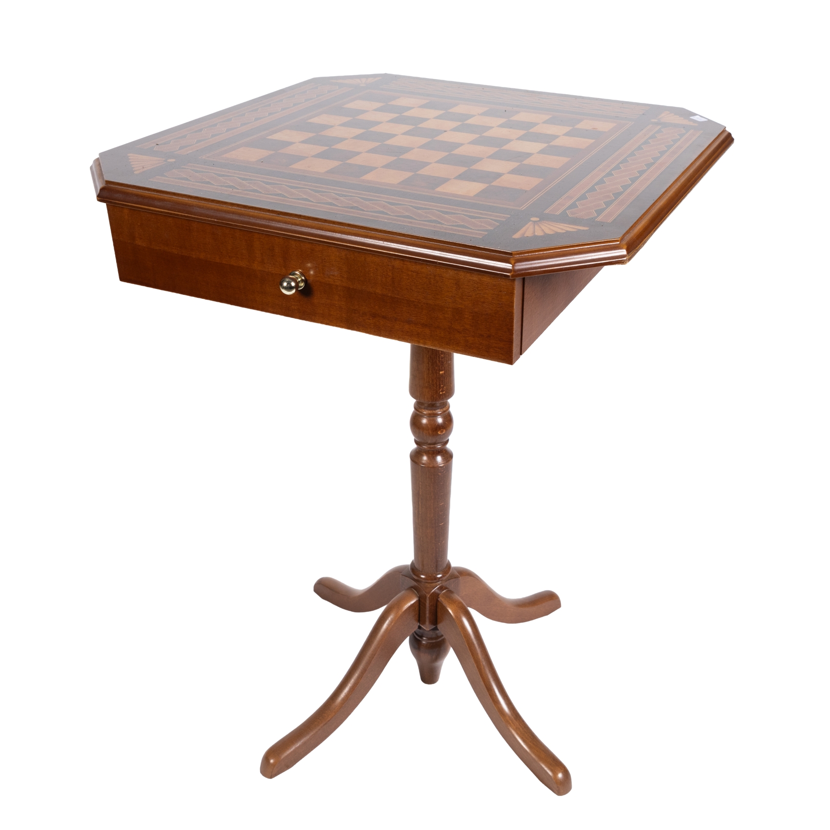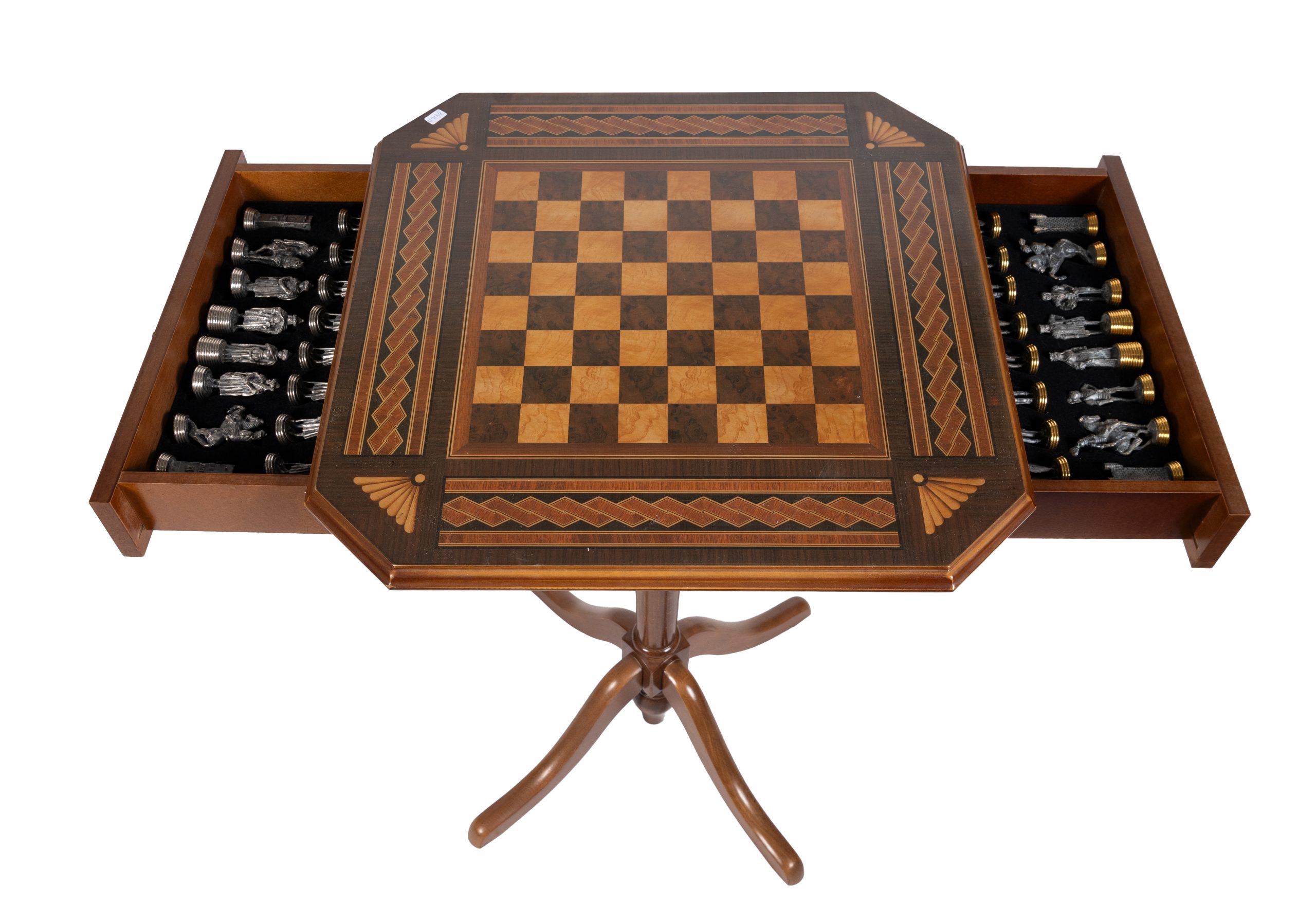 Mesa y juego de ajedrez de «Moros y Cristianos» completo. Mesa en madera chapada con estampación de tablero en símil marqueterías con dos cajones compartimentados para el almacenaje de las piezas.