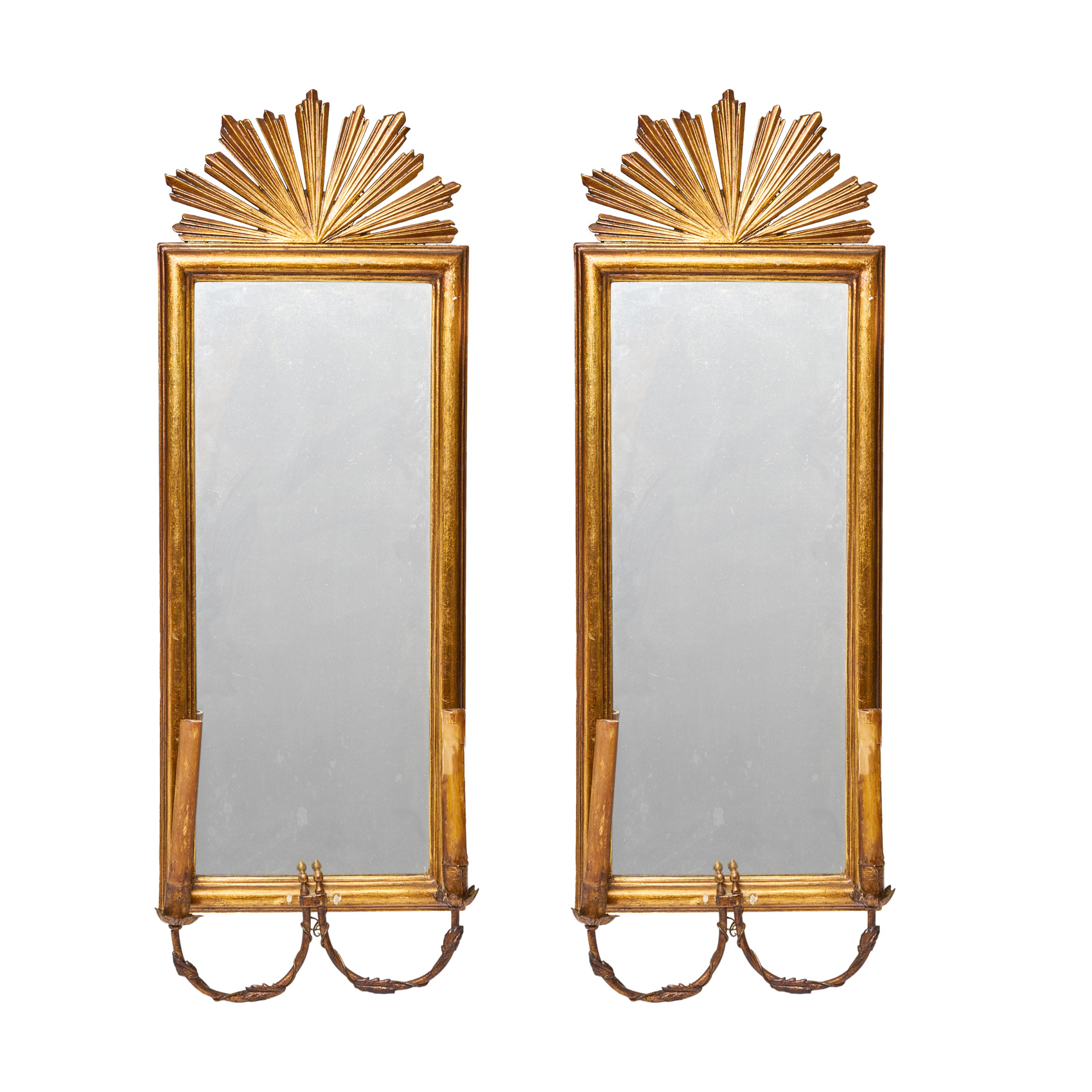 Pareja de espejos rectangulares en madera tallada y dorada con copete en forma de ráfagas y aplique de dos luces en parte inferior, s.XX.