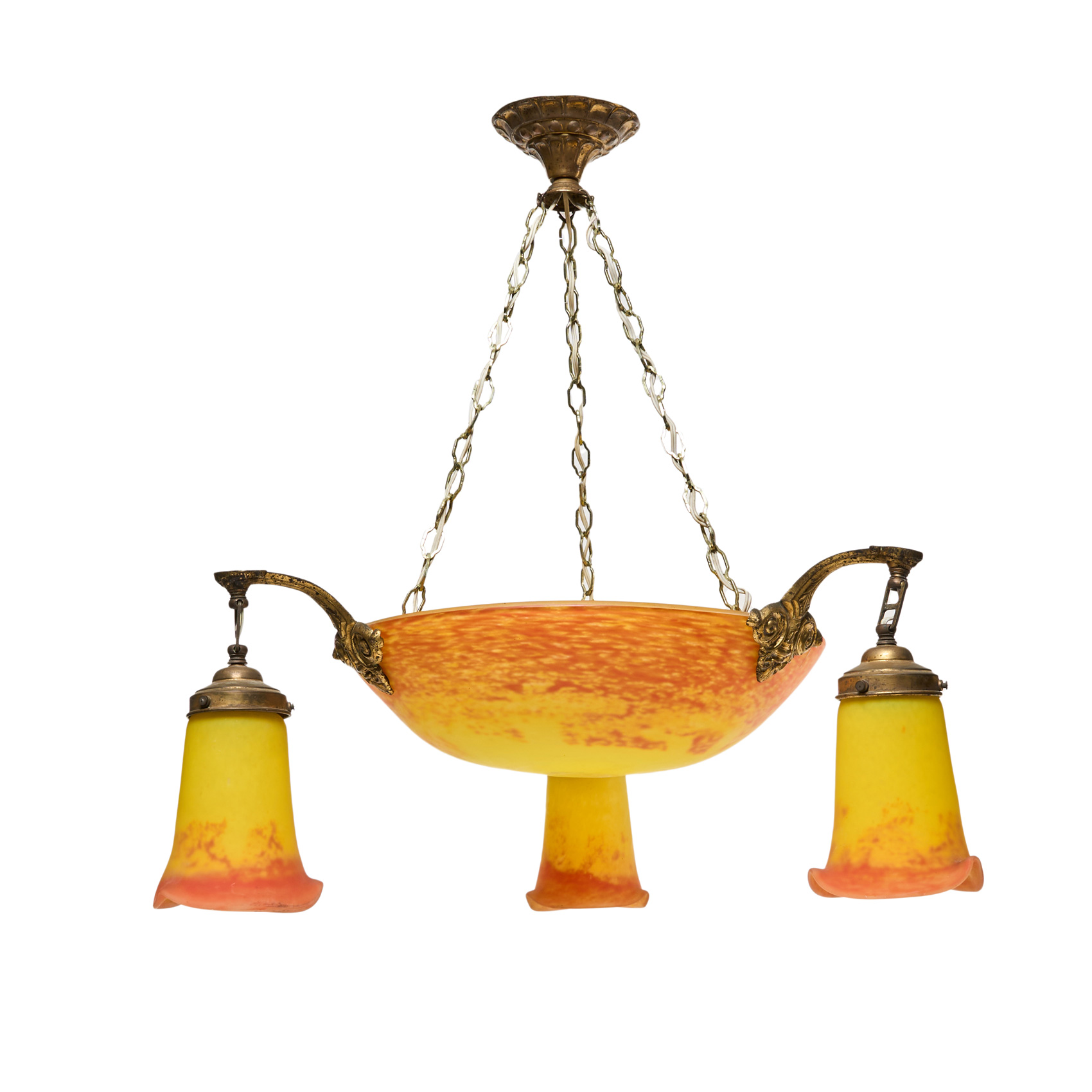 Lámpara de techo en metal con tulipas en «pâte de verre» de tonalidades naranjas y ocres, s.XX.