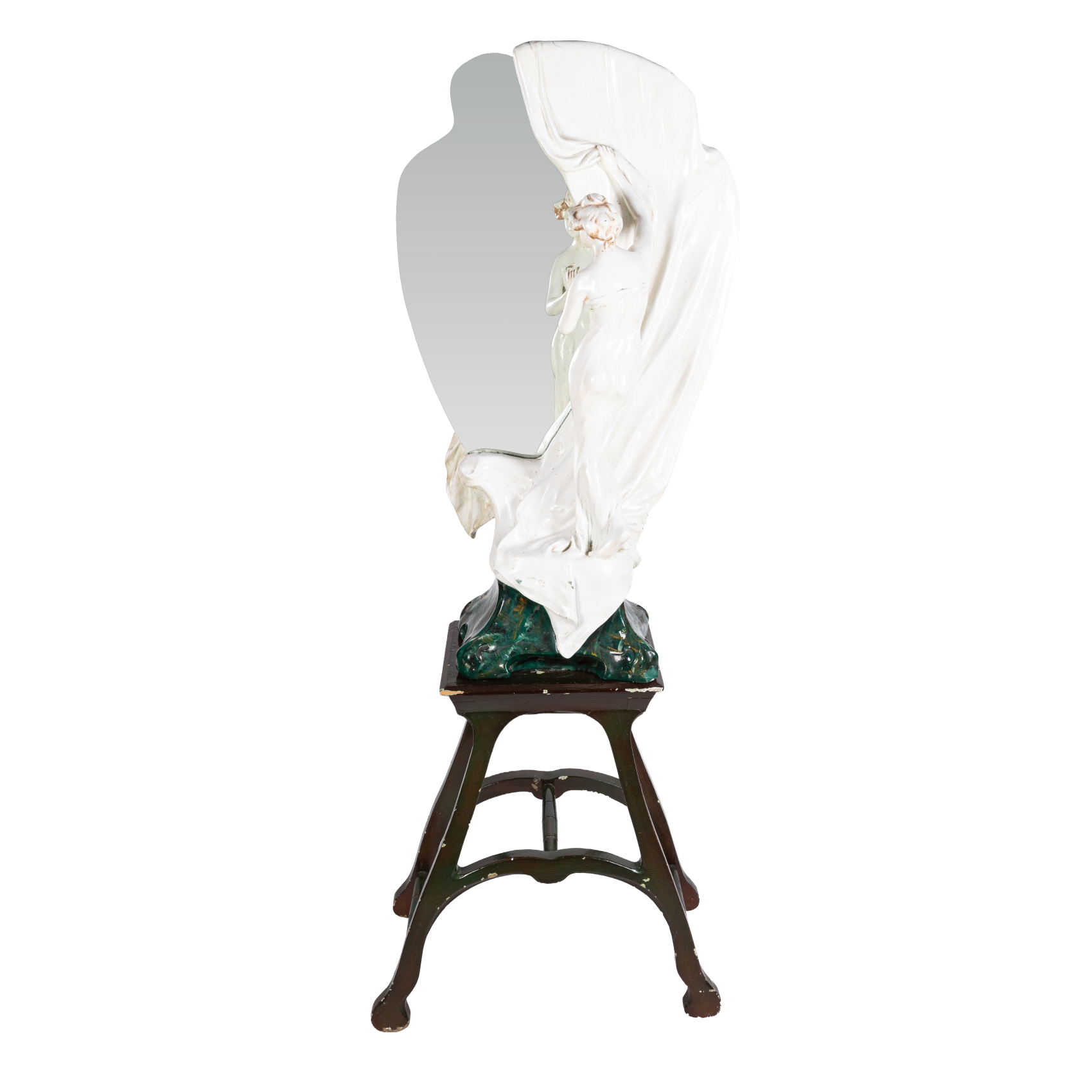 Espejo modernista en estuco policromado con representación de dama, primera mitad del s.XX. Apoya sobre mesa en madera.