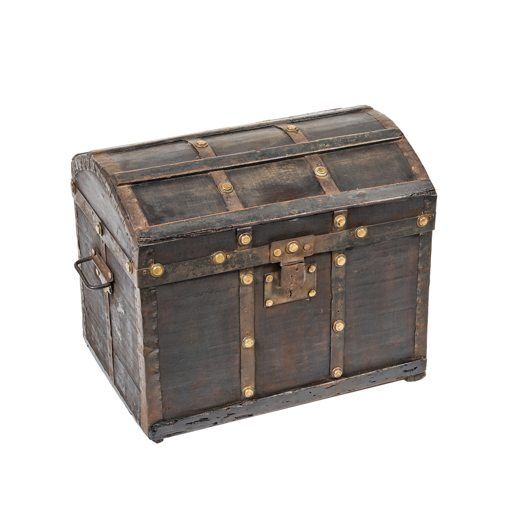 Baúl en madera revestida de cuero y refuerzo de tachuelas en latón dorado con listones y cerradura en hierro, ppios. del s.XX.