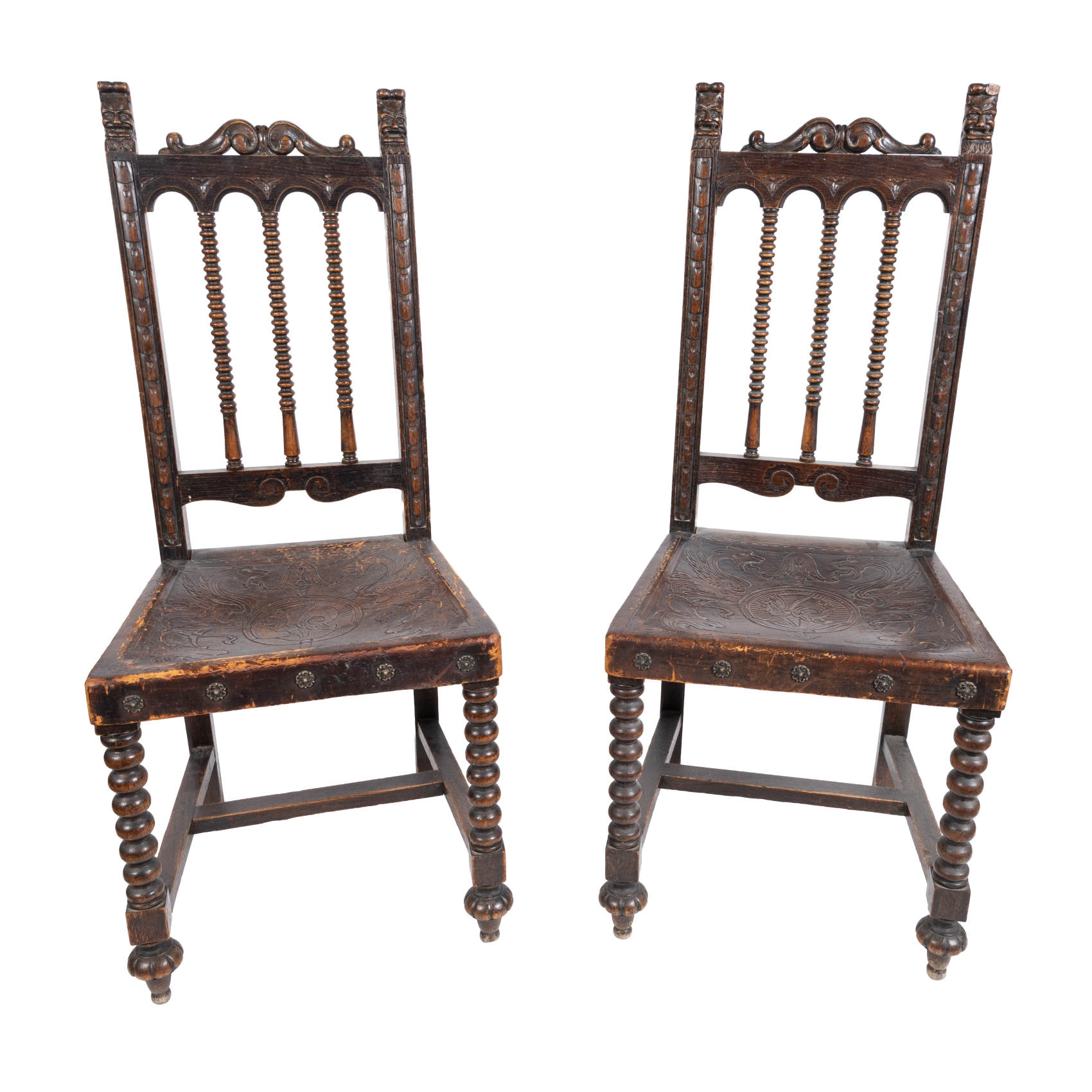 Pareja de sillas castellanas o de estilo renacentista en madera tallada y torneada con asientos en cuero, s.XIX.