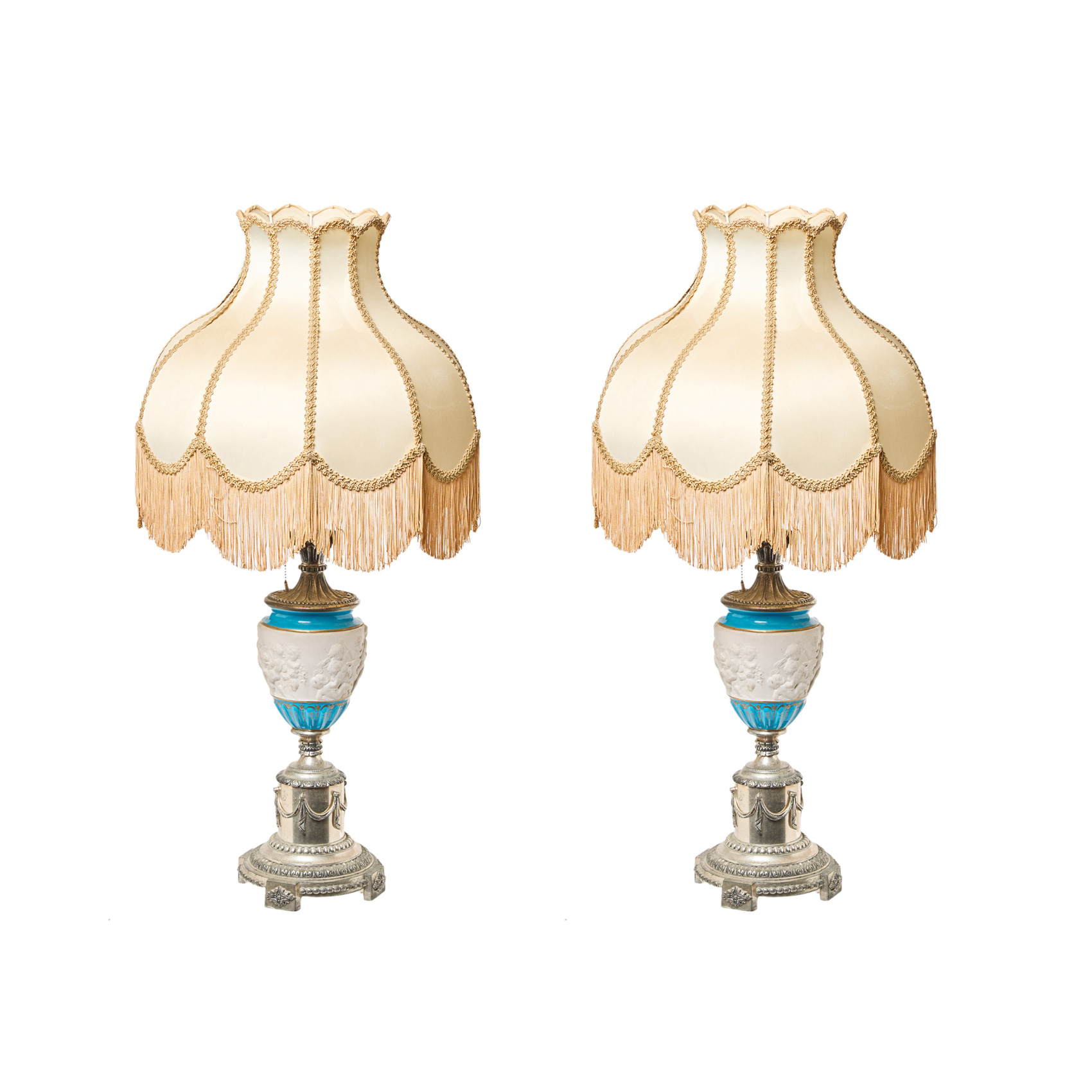 Pareja de lámapras de sobremesa con base en metal plateado y fuste con jarrón en cerámica francesa esmaltada, ppios. del s.XX.
