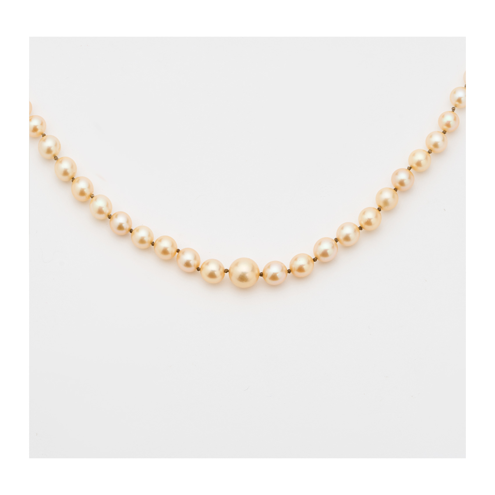 Collar de perlas cultivadas en degradé 9 – 4 mm. con cierre diseño lazo en oro, vistas en platino, diamantes talla 8/8 y perla cultivada de 5 mm., c.1940.