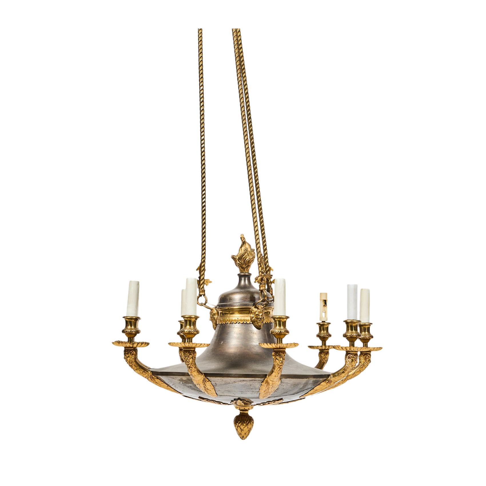 Lámpara de techo de nueve luces estilo Luis XVI en metal y bronce dorado, s.XIX. Electrificada.