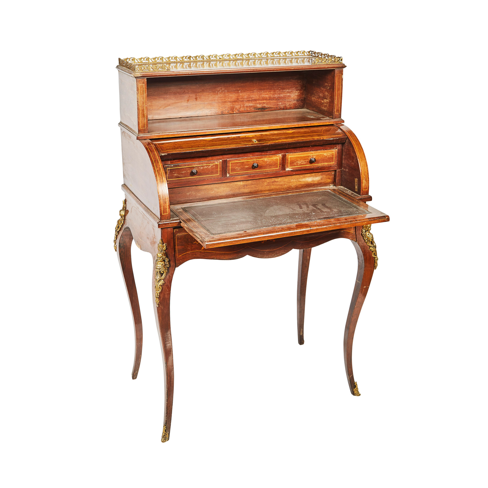 Escritorio francés en madera de caoba con marqueterías y fileteados en boj, fles. del s.XIX. Interior compartimentado. Sobre deslizable con un cajón inferior. Remates, arranques y barandilla en metal dorado.