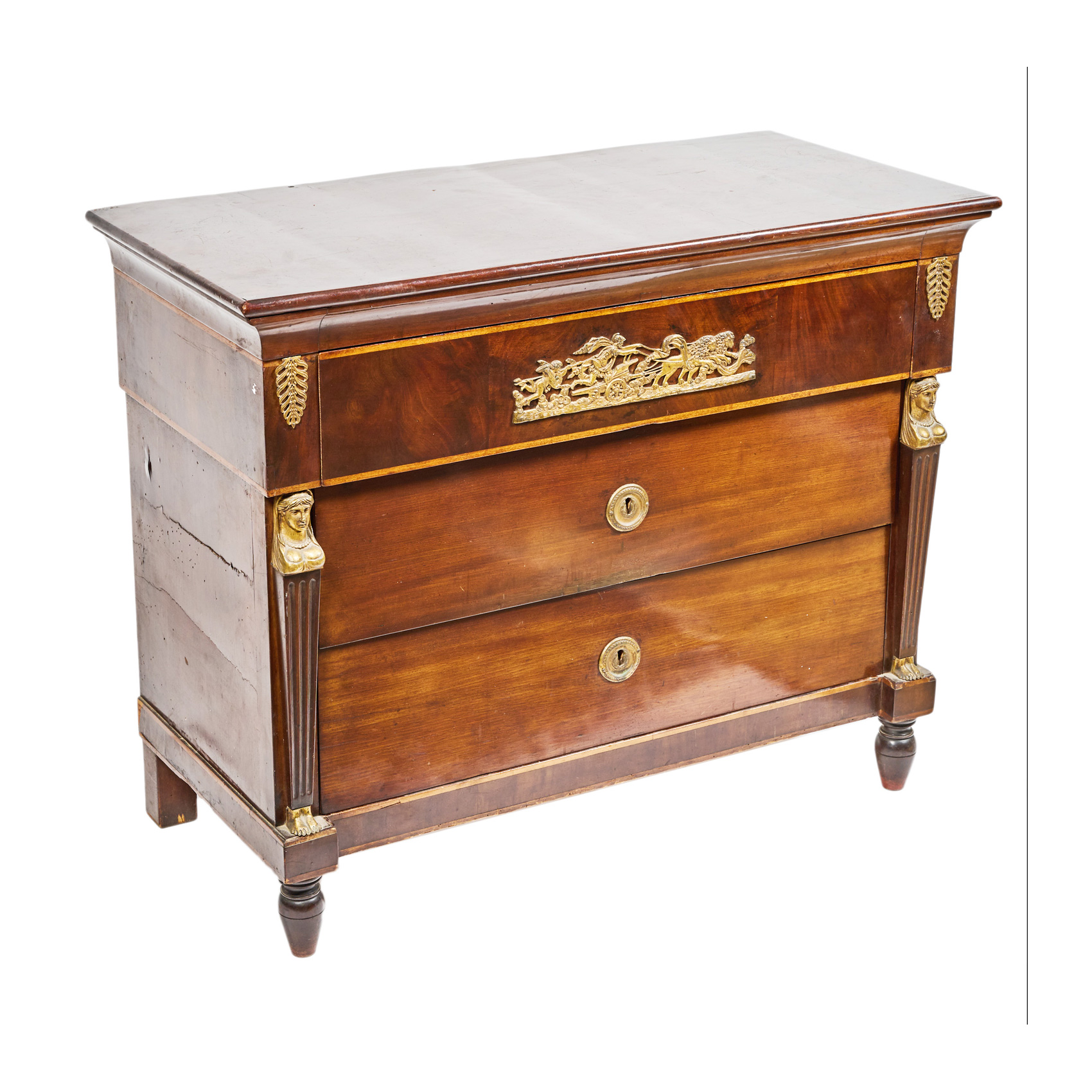 Cómoda estilo imperio en madera de caoba, s.XIX. Frente con tres cajones. Molduras, efigies y escena de corte neoclásico en bronce dorado.