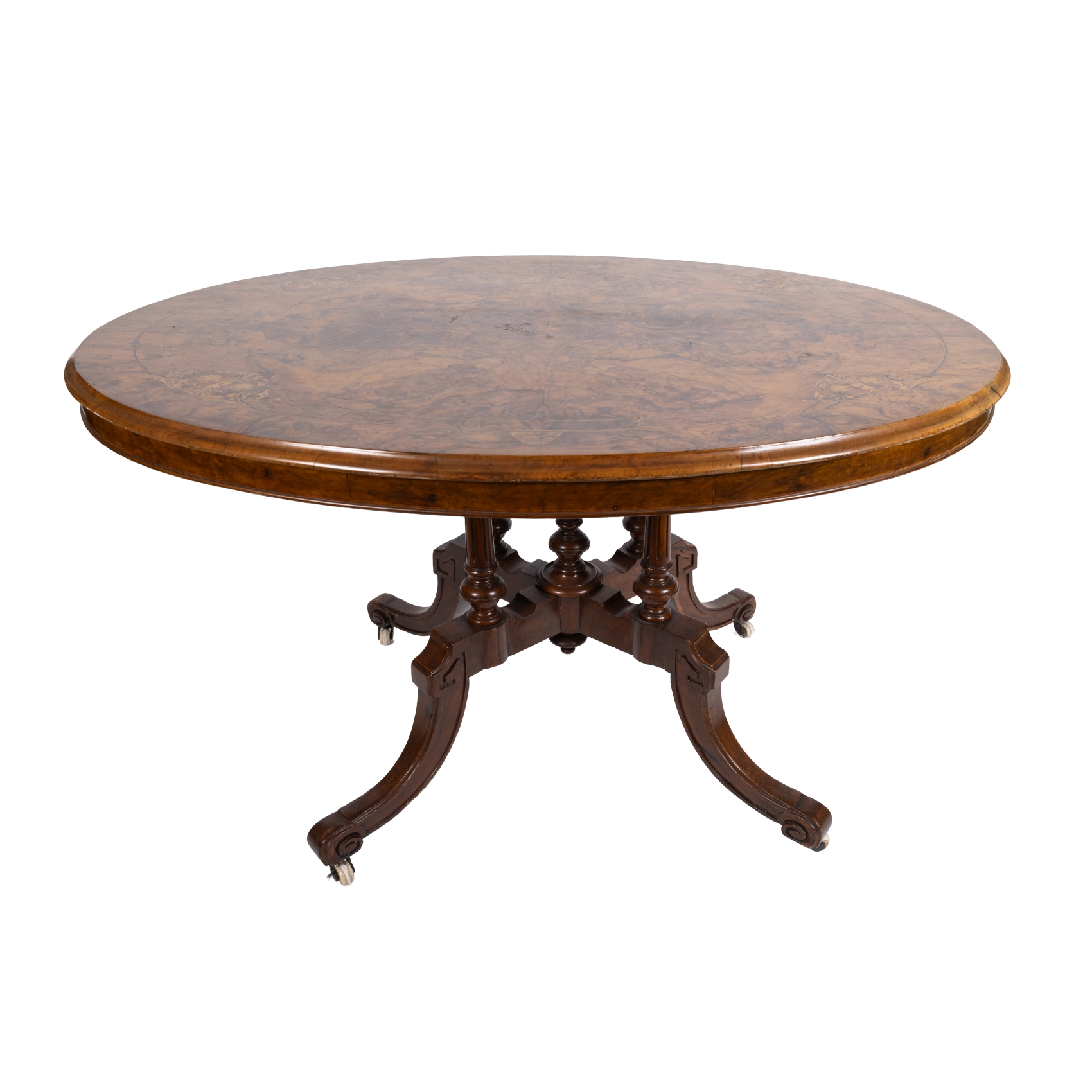 Mesa isabelina ovalada en madera de raíz de nogal con marqueterías y fileteados en boj de motivos vegetales, s.XIX. Patas torneadas rematadas por ruedines.