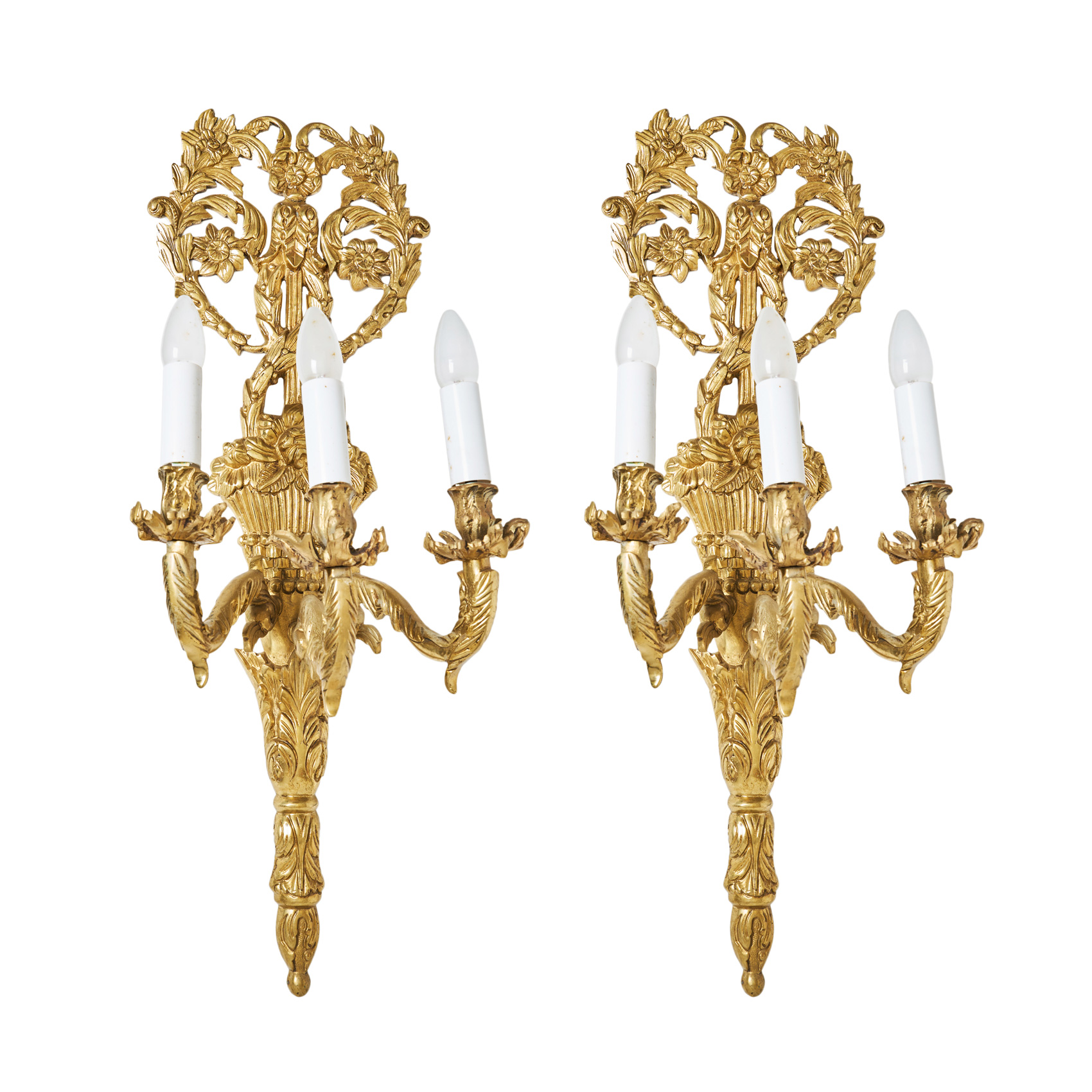 Pareja de apliques de tres luces estilo Luís XVI en bronce dorado con decoraciones florales, de roleos, acantos y de cestas, s.XX.