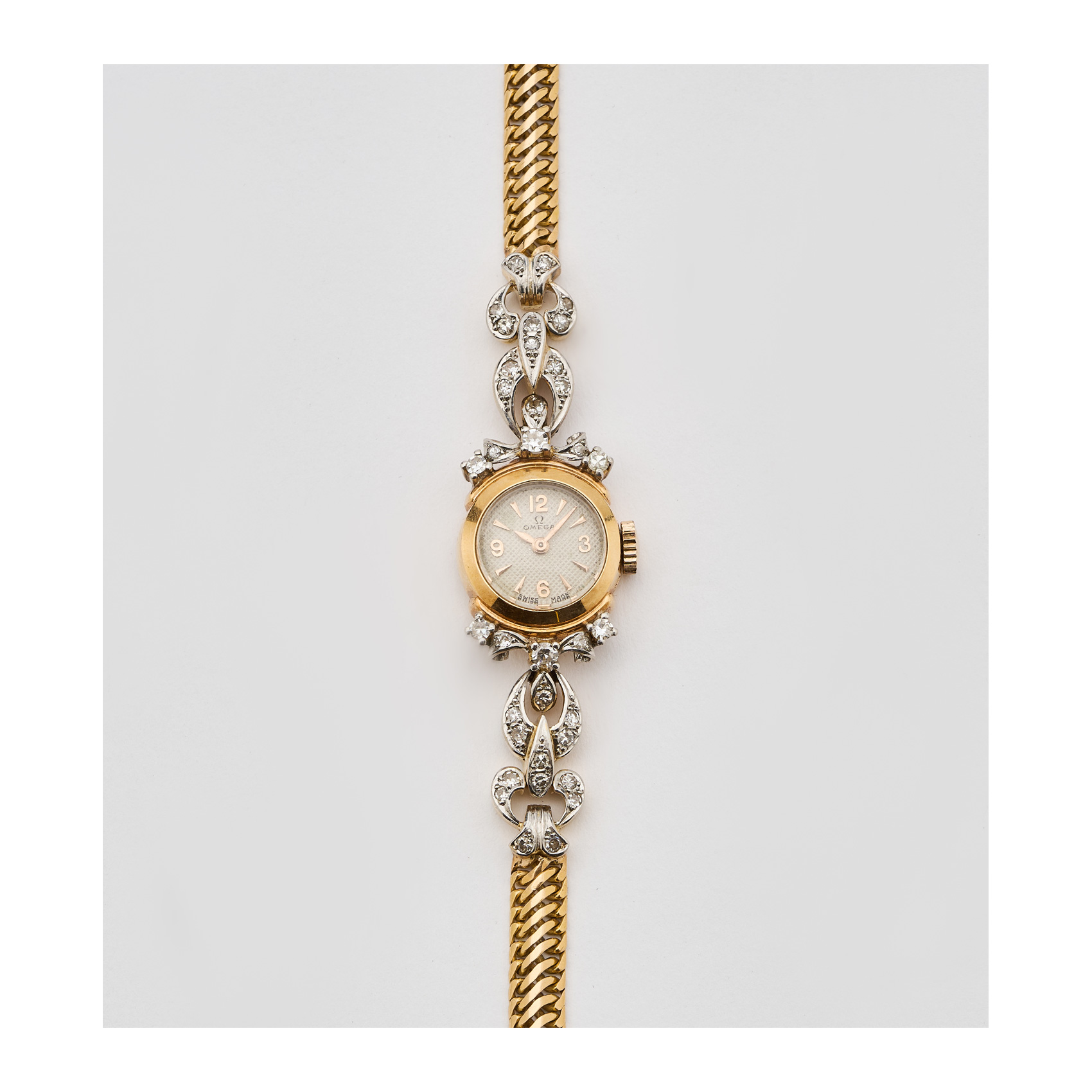 OMEGA, Reloj de pulsera para señora. En oro y vistas en platino,c.1930. Armis de malla y motivos calados con diamantes talla 8/8. Esfera guilloché con numeración arábiga y a trazos aplicados.