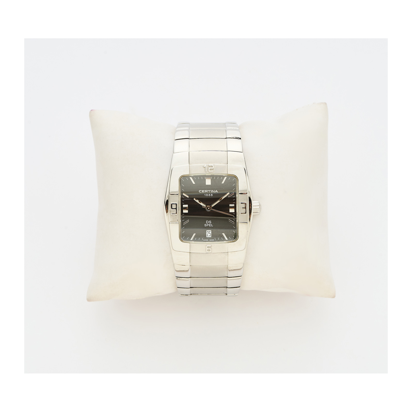 CERTINA «DS Spel», Reloj de pulsera para caballero. En acero mate y brillo. Esfera negra con numeración a trazos aplicados. Calendario fecha a las 6. Mecanismo de quartz.