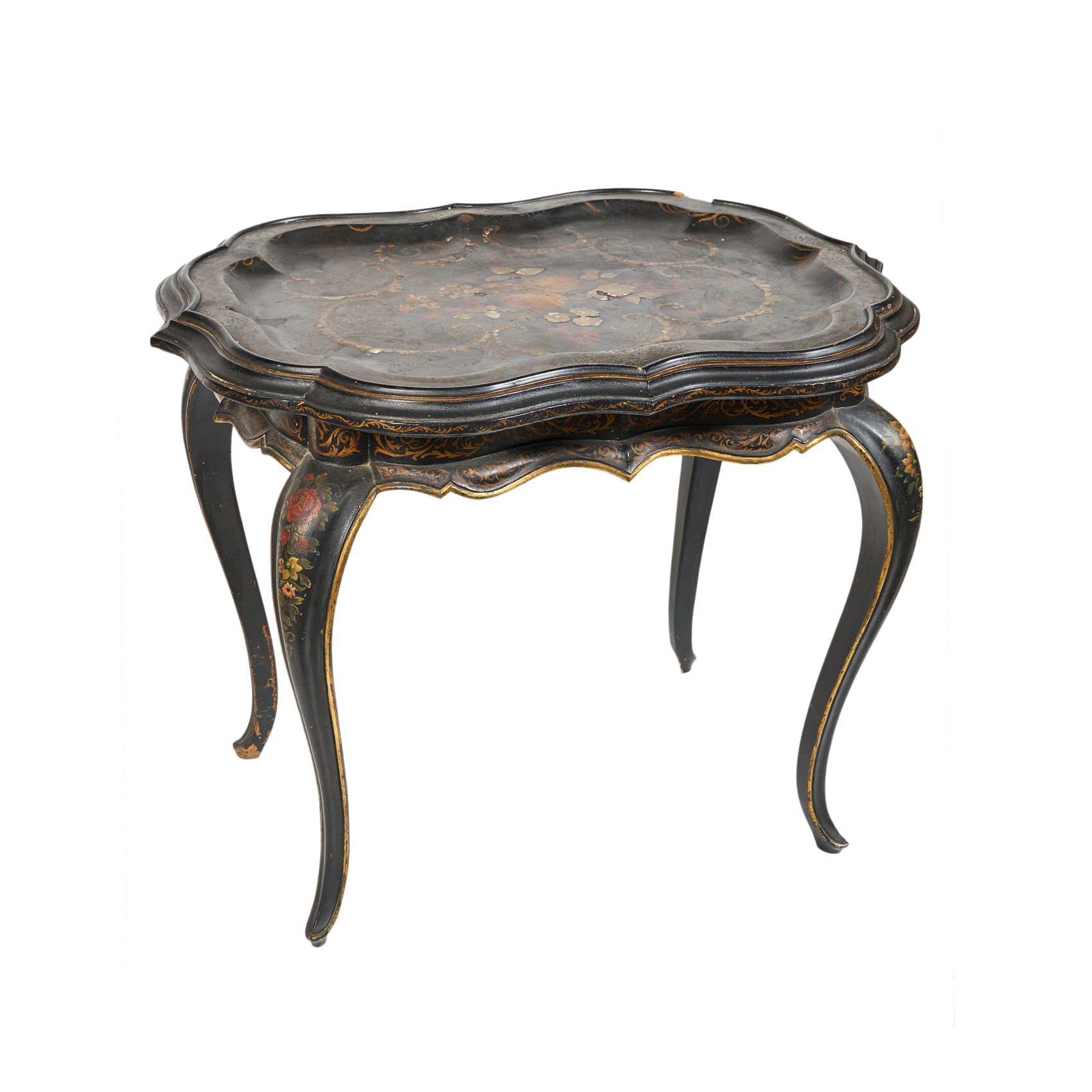 Mesa colonial hispano-filipina en madera policromada con marqueterías en nácar con decoraciones de motivos florales, s.XIX.