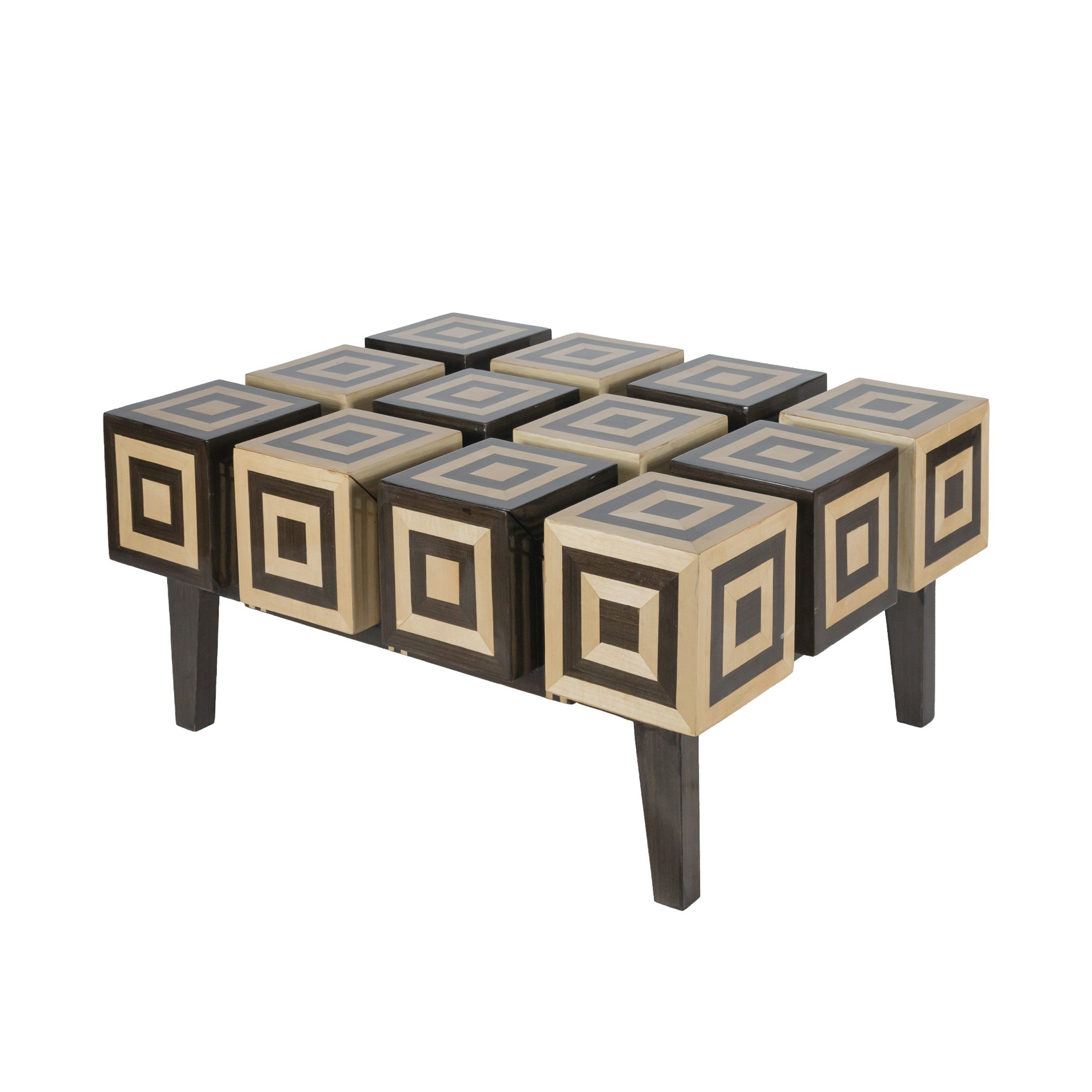 Mesa baja de centro con marquetería bicolor en negro y beige con decoración de patrón geométrico y cajón al frente, s.XX.