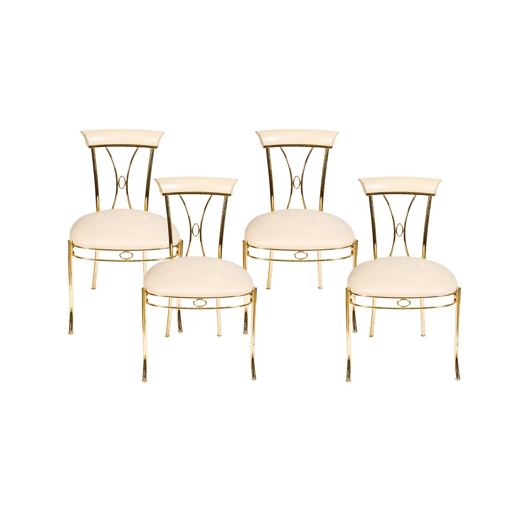 Conjunto de cuatro sillas en latón pulido con respaldo en madera policromada y tapizado en napa de tonalidad beige.