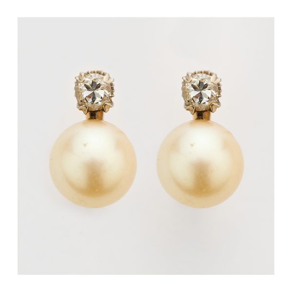 Pendientes tu y yo en oro y vistas en platino con perla cultivada de 10 mm. y diamante talla brillante engastado en garras.